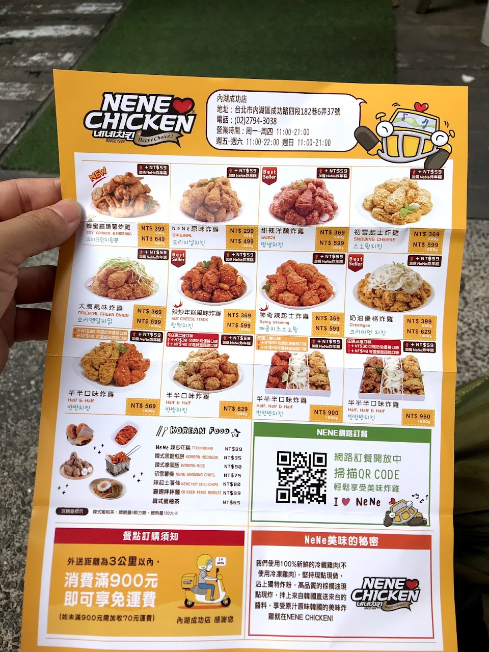 今天開會中午訂了NENE CHICKEN,一早是同事訂,應該是1100營業就訂,食物因為人多說需要製作比較久的時間是可以接受的,結果等了許久,1200打電話去店面問,結果店員回說”喔,剛剛有外送員拿走了喔”。想說從內湖捷運站,騎到國防醫學院應該也不用很久,而且已經站在學校民權東路六段大門口等。
