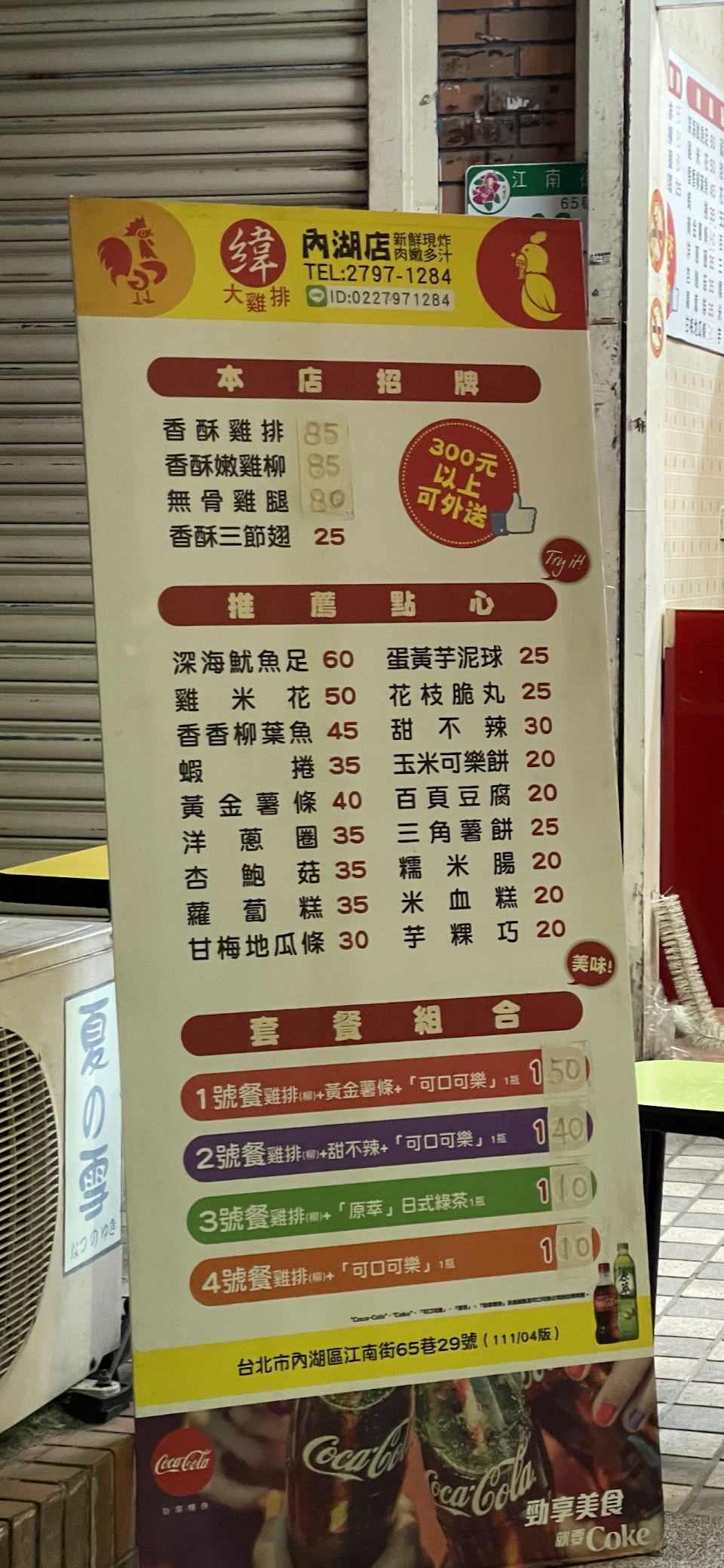 先不說雞排好不好吃,但是4號套餐附的飲料是350m 的可樂要價25元,這一點都沒優惠 實在是令人感到空虛。 服務 外帶 餐點類型 其他 平均每人消費金額 $1-200