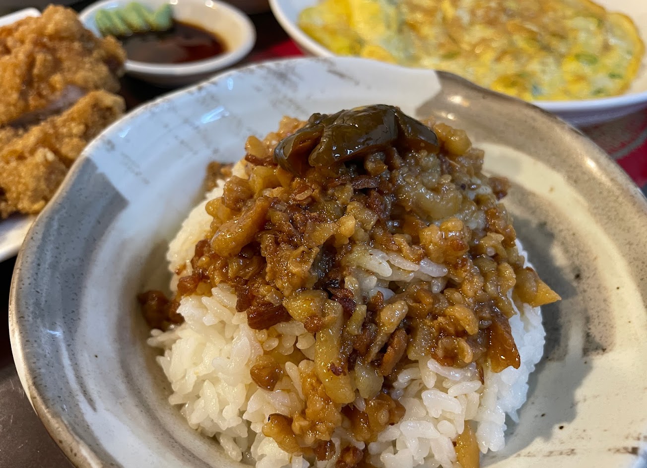 ?肉燥飯,以偏肥的肉燥為主,醬汁甜鹹適中,拌入飯中帶有脂香。