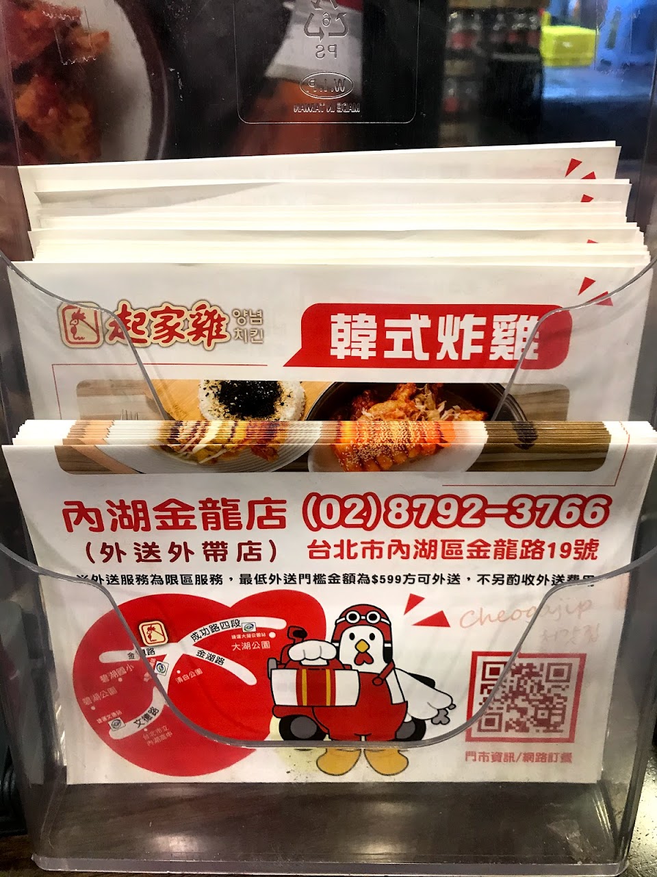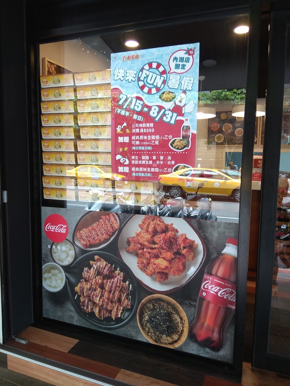 嚐鮮試看看:) 心得: 原味炸雞趁熱吃非常嫩又多汁,會燙口! 外面裹的東西很少,雞皮脆脆的。冷掉就很普通。 招牌洋釀可以選要不要辣,不辣的口味是偏甜,醬汁稠稠的甜鹹甜鹹都很棒!熱熱吃根本人間美味~~但是跟在韓國吃的還是不同,韓國還是大勝啊! 很貼心附了兩雙手套跟一包醃蘿蔔,外帶盒(499那個)很不錯?有提把!但是可樂只有250cc的鋁罐一瓶真的真的太少,醃蘿蔔好少,泡在醃漬液裡的重量比蘿蔔還重。 現在有活動送炸年糕,偏硬硬QQ的,是我喜歡的口感 服務人員是一個不喜歡帶包包的可愛女店員,很親切而且又好可愛。推推!