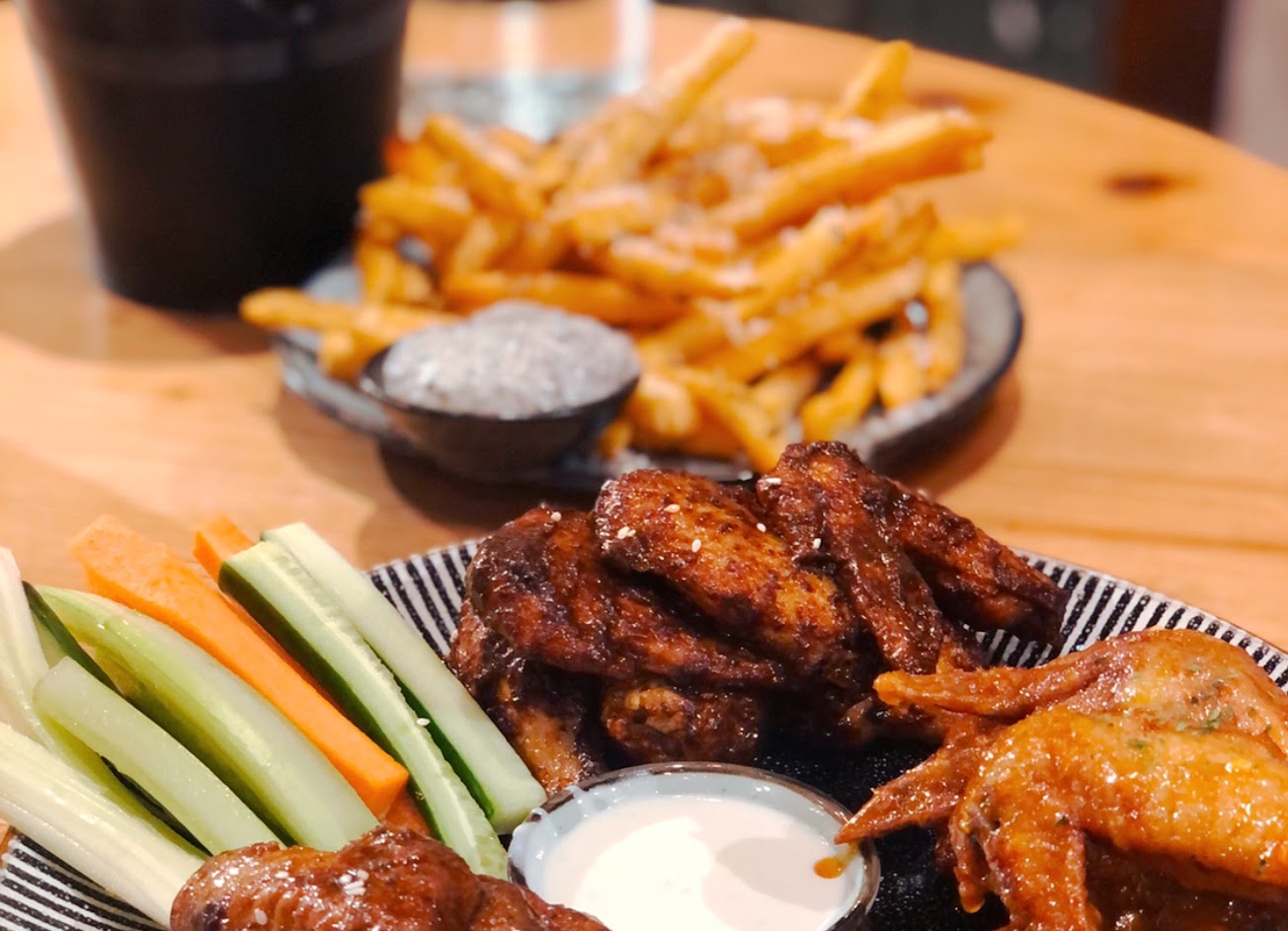 時尚餐廳,供應海鮮、雞翅、披薩與肉類料理,另有雞尾酒、葡萄酒與精釀啤酒。