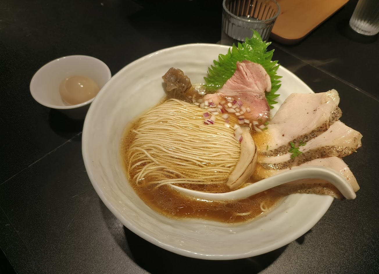 「濃厚雞吉君」湯頭在火侯的控制下濃郁順口,每口都能品出濃厚的雞香,味道平衡的令人無法挑剔。麵體選用粗麵,口感扎實,說不上特別Q彈,但令我著迷的是麵體能實實地巴住湯頭,將其涮入口中,這份幸福感是我無數再訪的理由。炙燒後焦香的豬梅花,熟度完美的雞叉燒呈現的相當有水準。蒜苗、紫洋蔥、柚子胡椒的配置也是畫龍點睛:蒜苗的口感及氣味夾著麵一起享用增加層次,紫洋蔥裹著濃湯後,抵銷了洋蔥的嗆辣感,從中則是扮演洗刷味蕾的重要角色。最後的柚子胡椒我個人是留至中後段轉味搭配食用,伴食或是攪和入湯,清香的果皮味帶一點點青辣椒的刺激使得湯頭轉變風味,讓一碗麵有兩次享受湯體的美食盛宴。