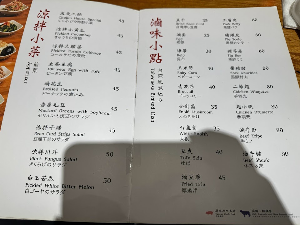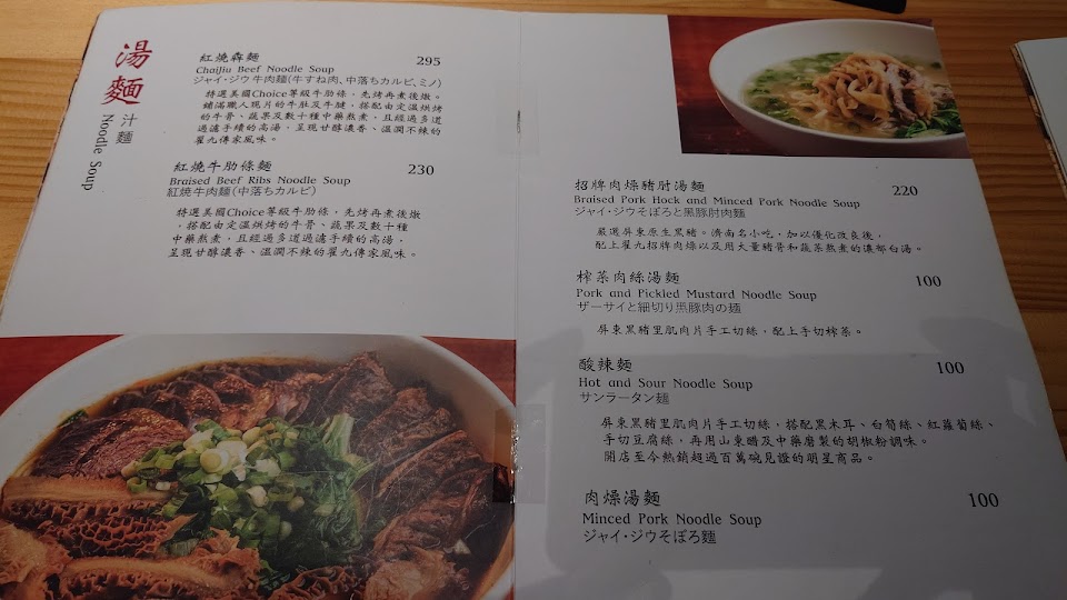 一開始覺得餃子很普通,面皮太厚太粉,吃了別的決定把餃子留到最後吃,用來洗嘴巴…滷味要蘸醬,蘸醬就太咸,豬耳朵很肥,海帶有海的味道,鹵蛋看起來也很奇怪外皮都爛爛的。牛肉麵的麵一吃就是機器壓出來的,牛肉嚼一嚼有一些酸味,酸辣湯有一股奇怪的甜味,肋條飯太咸,米吃起來也很普通。没有茶水,要单独点价格也偏高。
