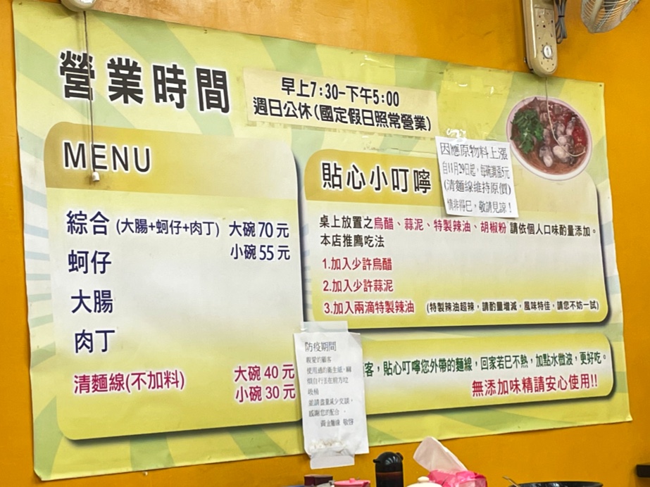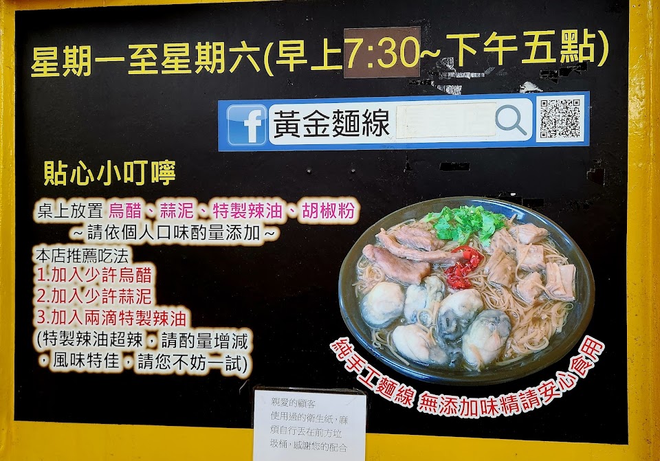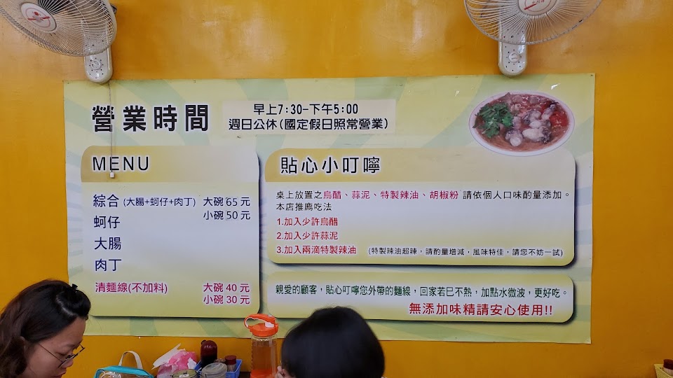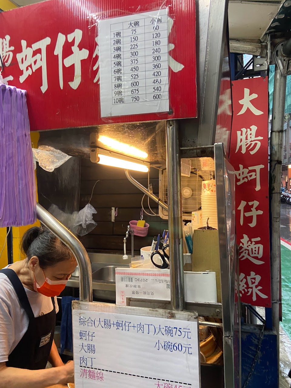 很特別,麵線裡面有很少量的筍絲提味。漲價大碗75,蚵仔很大顆。好吃,綜合有蚵仔、大腸、肉條,一定要加胡椒粉、烏醋、大蒜泥跟他們家的辣椒2滴。大蒜多加好吃~營業只到下午5點,星期天(sunday)沒開。