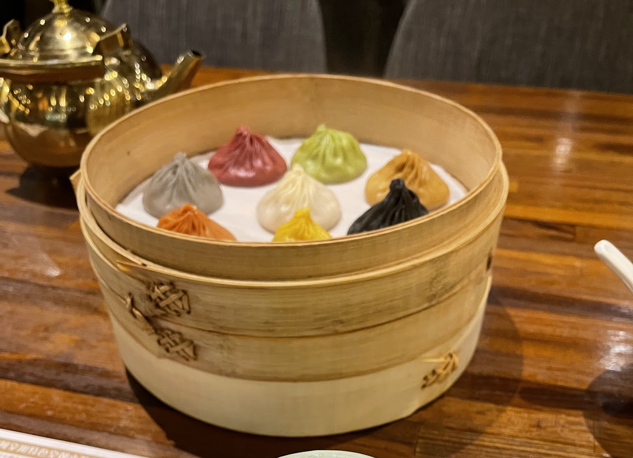 雞湯味道清淡不油膩,竹筒剁椒魚片香香辣辣剛剛好,鍋貼外皮酥脆內餡多汁,繽紛八色小籠包則是視覺效果大於味覺,我喜歡的味道大概只有三種(原味、蒜香、川味),蟹粉、鵝肝腥味較重,糟溜絲瓜味道比較嗆,起司、黑松露則味道太特別有點不適應。