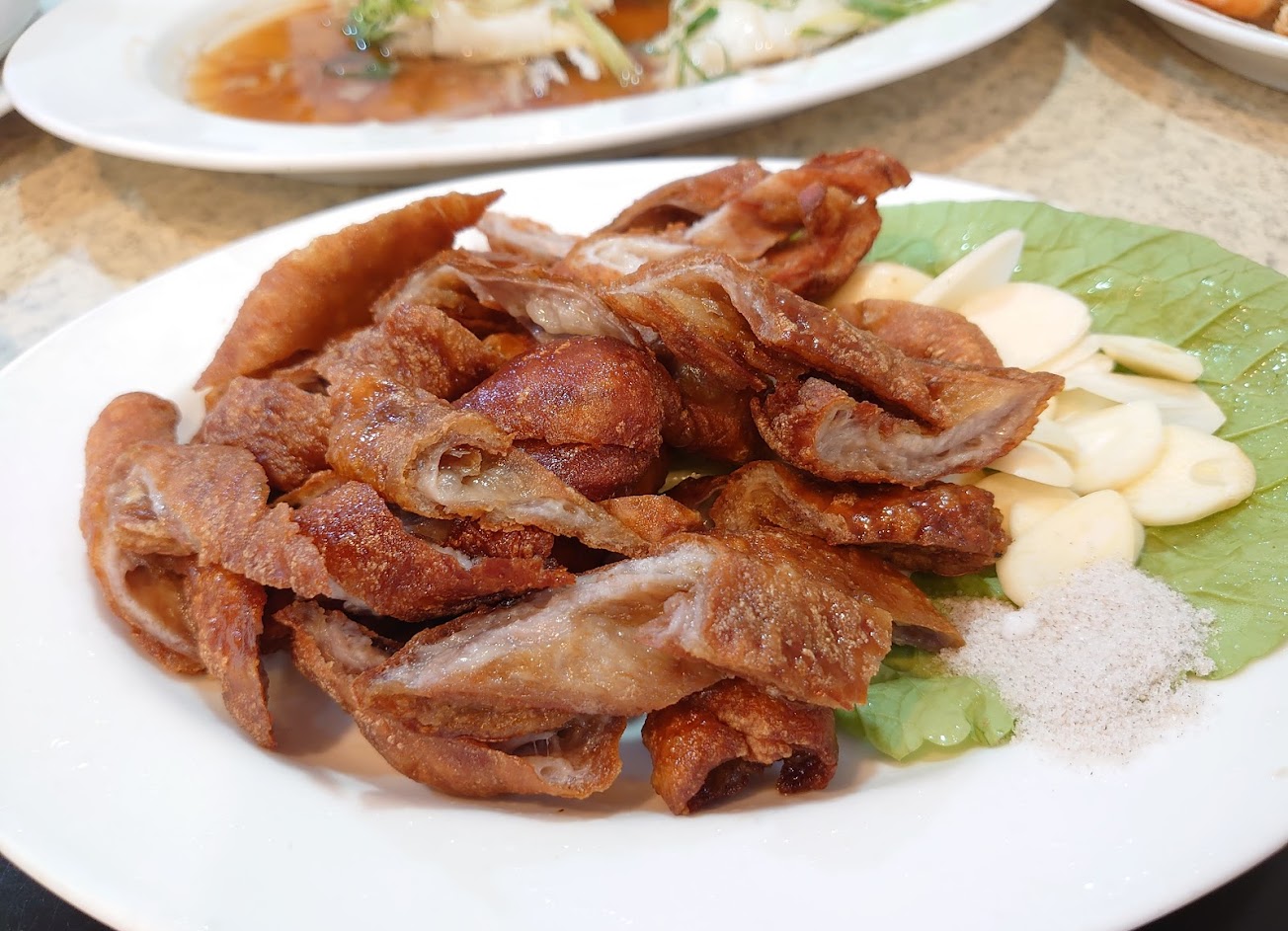 首道脆皮炸雞,皮薄微酥甜,肉嫩不柴無腥味,調味不過鹹,直接吃就很夠味;第二道臘味拼盤,三種臘味油香不膩,味道比想像中清爽,搭配新鮮蒜片,咀嚼時口頰滿香,十分下飯。