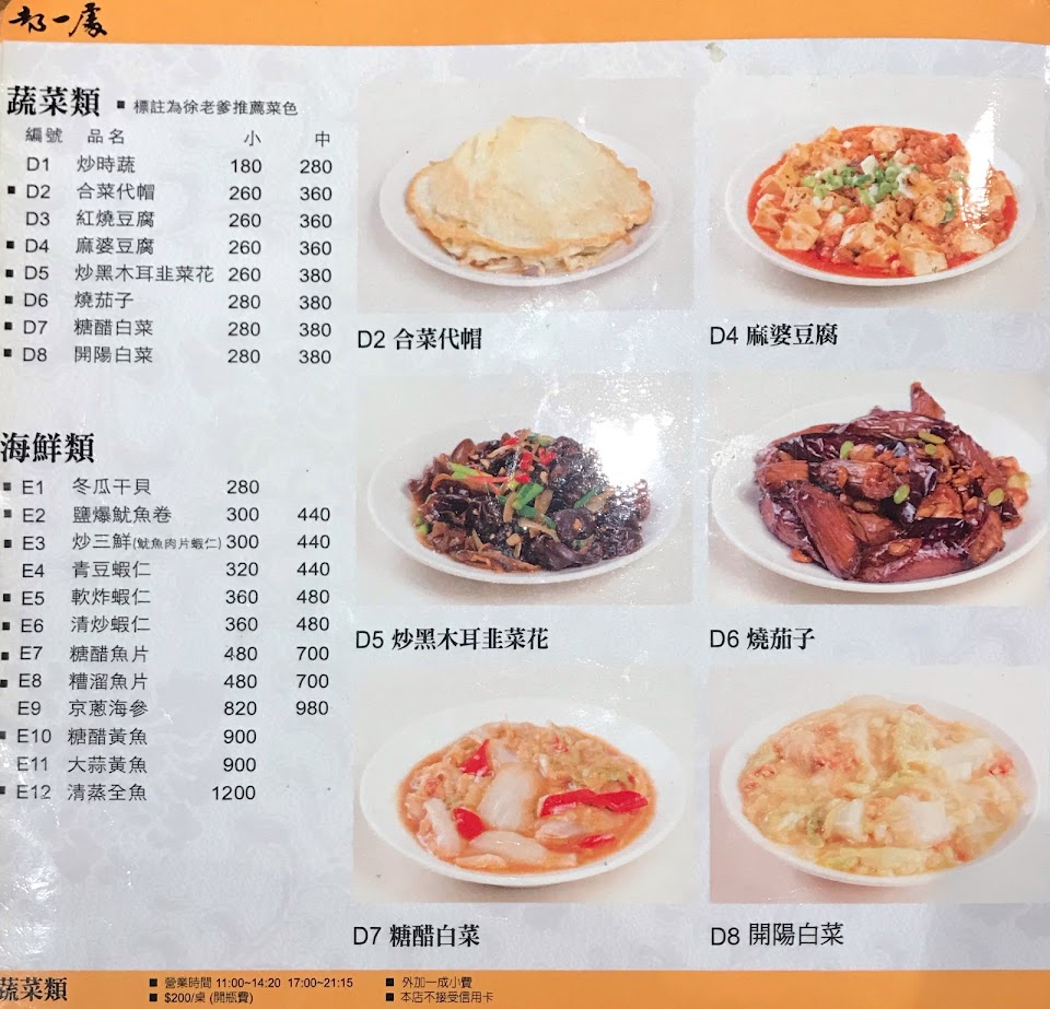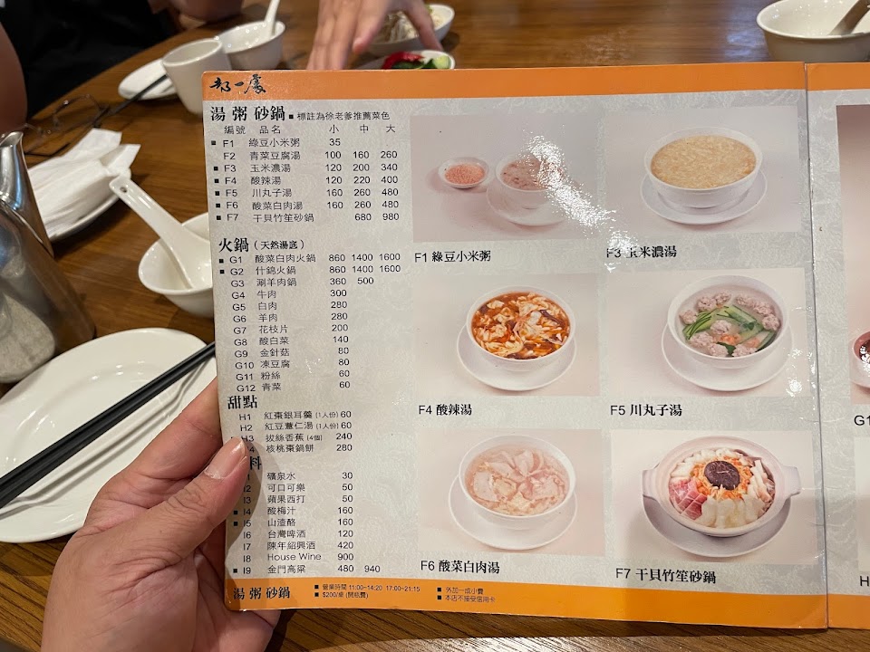 價格在臺北的中式料理餐廳裡算是偏高的,口味是不錯吃,服務人員也很親切。不過餐廳的SOP流程十分有問題,譬如開兩桌同時點單但上菜時間竟然相差近一小時。電鍋故障沒有白飯也沒有告知客人提醒可以更換麵食,因此足足餓了一個小時。電鍋修好了、白飯送上來也沒有菜可以配了,十分誇張。食畢後認為這樣的SOP根本不值得收服務費,店家方以老闆不在拒絕,並且再以人手不足為理由搪塞。這也凸顯另一些SOP問題,也就是權力未下放予高階主管,老闆不在就沒人能作主;還有沒那個人手就不要接這麼多桌。最後僅能不收白飯與其他主食的價錢(與服務費的數字仍相差甚遠)打發了事。真的是令人開心走進來、失望走出去的餐廳。
