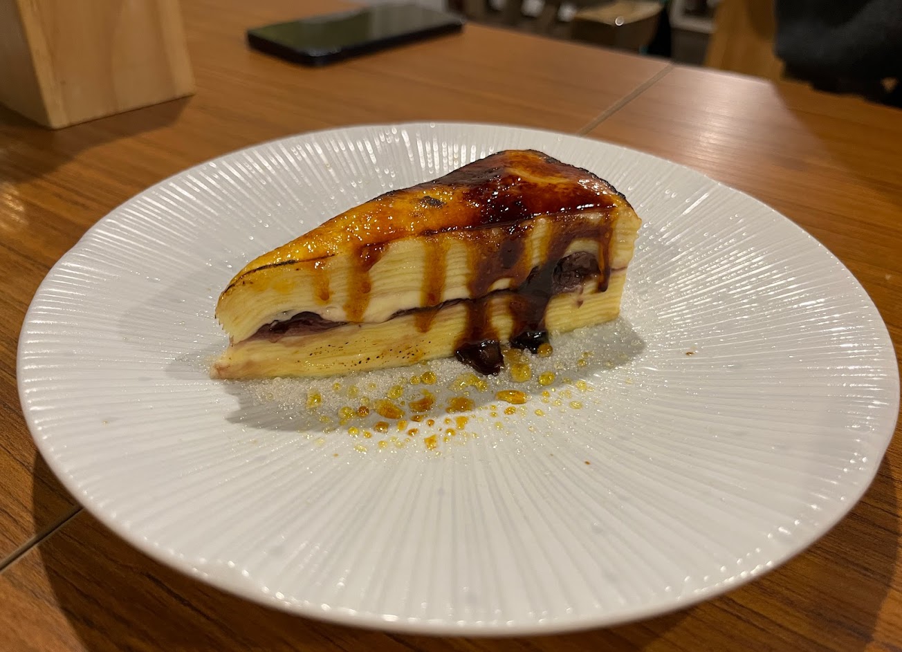 甜點部分今天千層口味是焦糖乳酪?之類,一刀切下去就知道有水準,內餡跟皮的濕潤度非常好,乳酪醬濃郁但不油膩,配上皮淡淡的蛋香,我願意成為它的信徒?