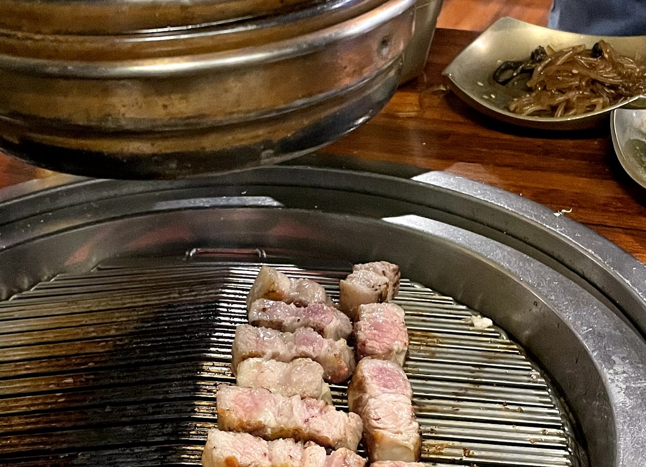 交通非常方便,小菜無限續(如果冬天可變化1-2款有溫度的小菜會更棒,例如冬粉.燉馬鈴薯等等,當氣溫偏低時,可適度加熱微溫,讓小菜不只是涼菜),服務人員會桌邊服務幫忙考肉,我們點了很經典的豬五花,經由專業的手,烤出來果然Q彈美味!另外也有非常多現做熱食,我們點了 鮪魚壽司 炸雞 馬鈴薯煎餅 豆腐鍋 韓式炒飯.生菜包肉⋯,三個人點一堆,份量實在太多了,非常滿足!