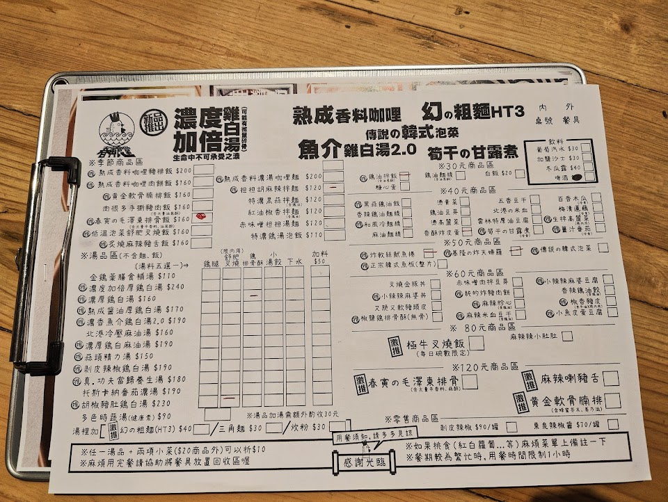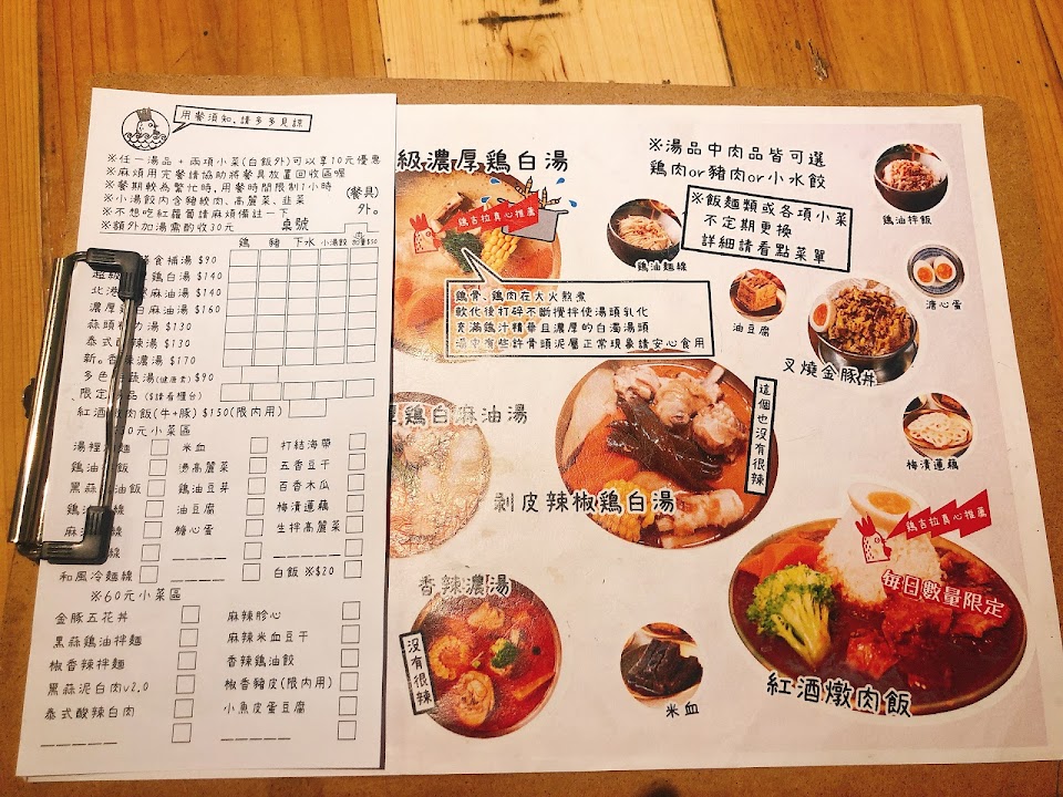 貪心一點 看到想點的就大方的點下去 因為我們就是點不夠多 所以沒有很飽 但吃的也很開心 因為雞白湯很好喝 雖然份量真的偏少 但至少口味我沒有失望 店門口也很可愛