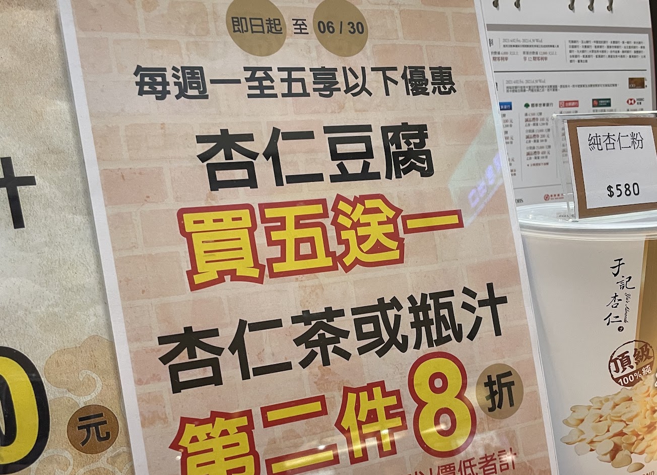 杏仁茶顆粒感粉感很重,喝起來卡喉嚨。服務人員強力推薦優惠方案可以多買,認真考慮了以後我們就更改購買品項,然後一直在旁邊的一位才告知那些優惠方案假日不適用,很浪費客人時間。最後很不客氣地說不要靠到他們裝潢的木門…