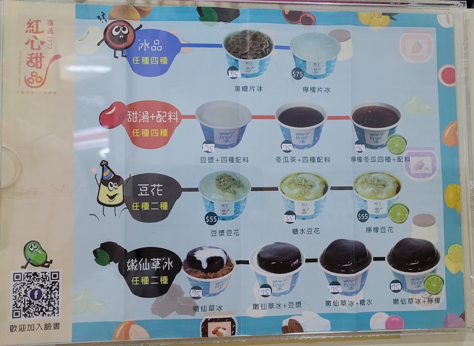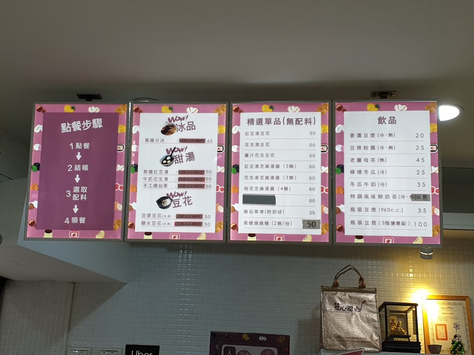 配料選得是芋圓、芋頭、黑糖粉粿和粉圓,店家給配料都很阿莎力,最推薦黑糖粉粿,Q彈有嚼勁,吃起來很有趣,且黑糖味很夠又不死甜,口感讚,不愧是店家推薦的佐料,其他也看到很多客人點鳳梨等等,我想配料部分都不會有雷的。另外,豆漿豆花類也有客人愛點。
