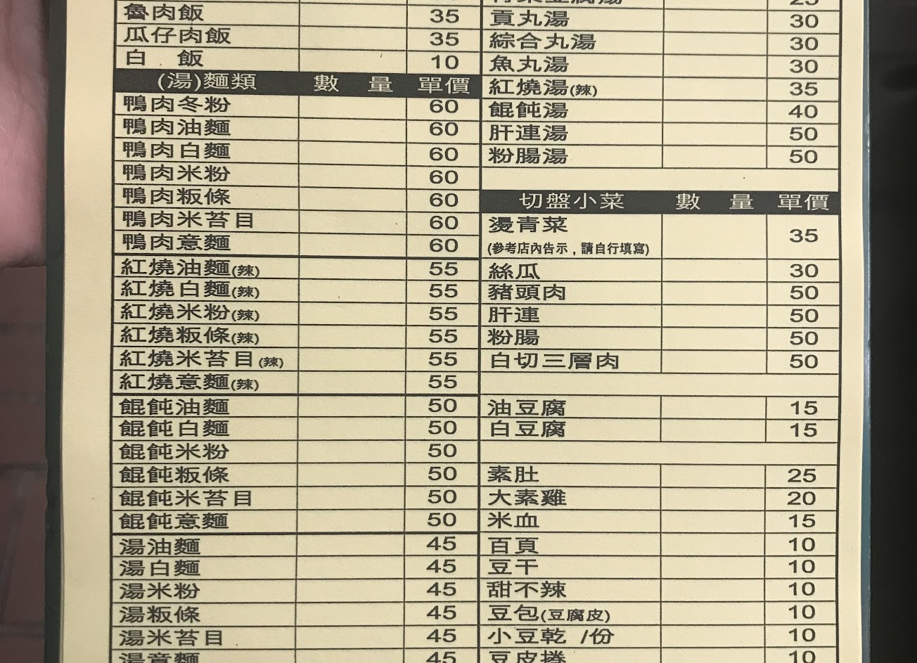每次經過店內客人都超多,今天下午終於排到第一個外帶。餛鈍麵,湯圓湯頭順口,餡料好吃。瓜仔肉,魯肉飯,滷豆腐也好吃。大推。