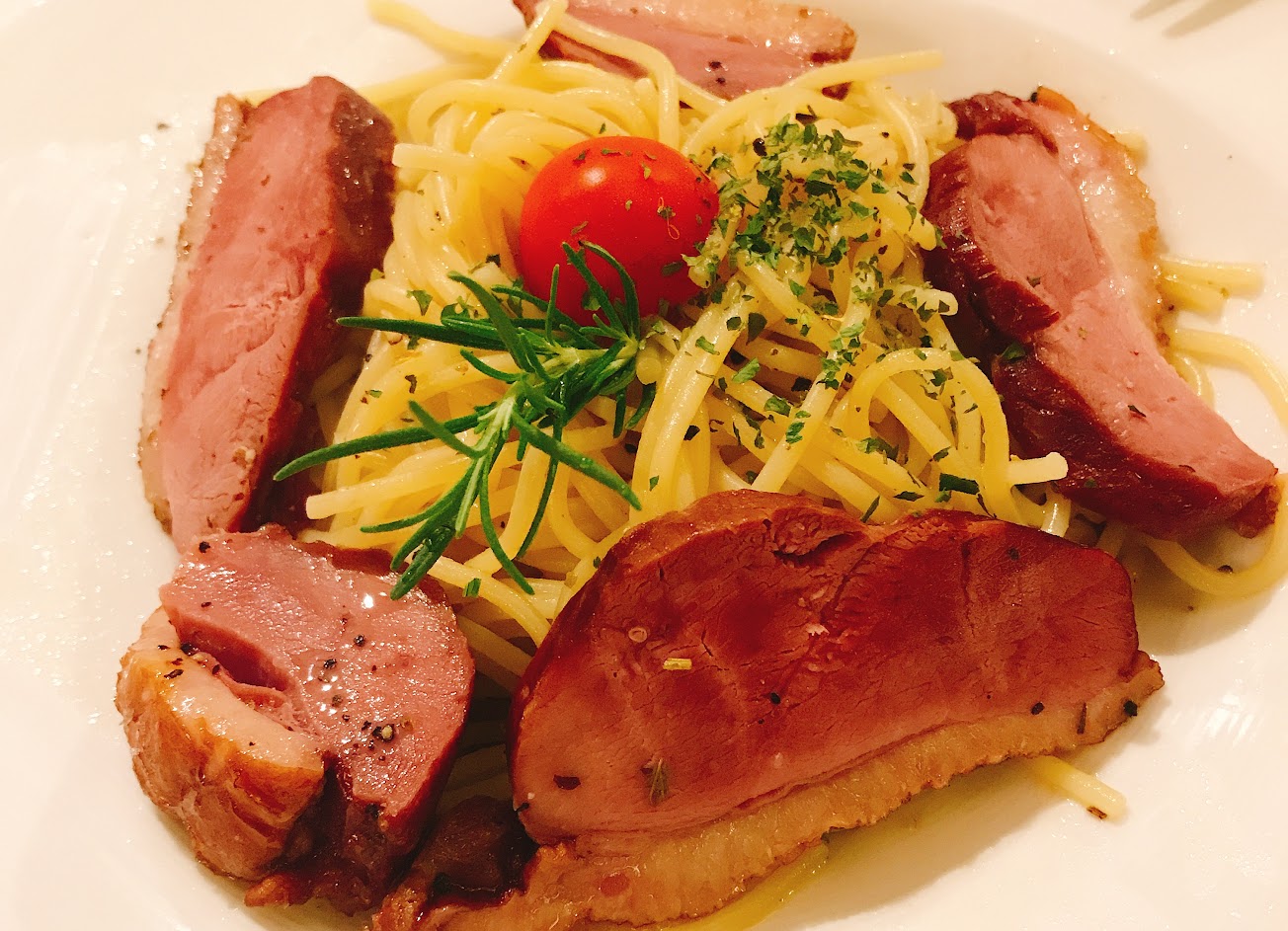 清炒木燻鴨胸義大利麵: 這絕對是我在全台灣吃過最好吃的義大利麵條之一,香料的搭配達到了一個接近完美的平衡,沒有任何味道過重或不足,一切都剛剛好的義大利麵,反而讓搭配的木燻鴨胸顯得有些遜色了。