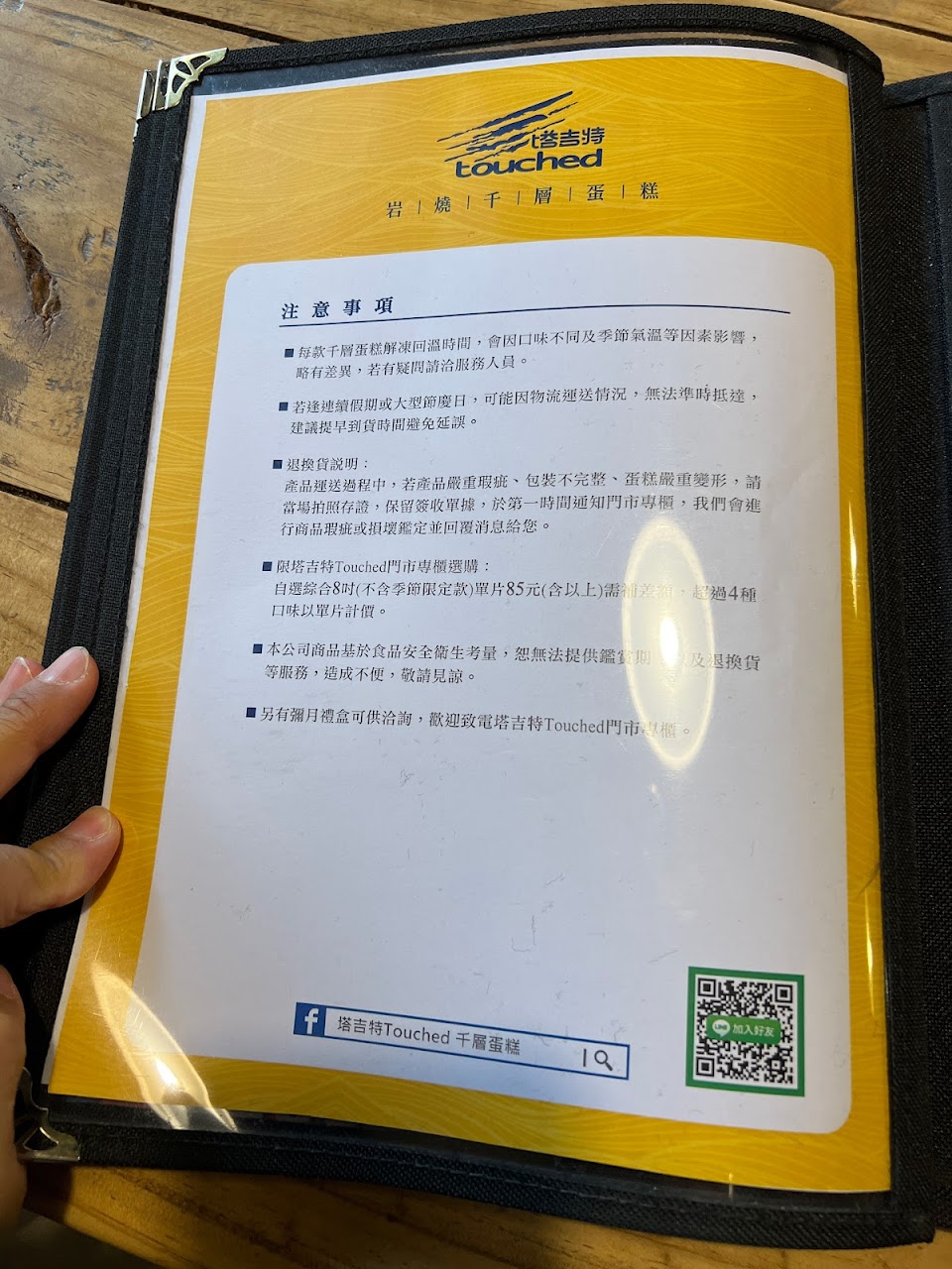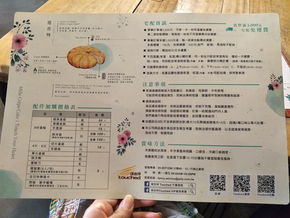 可以選4種口味各3片,幾款價格較高的口味要補差價。從6、7年前的8吋$650(單一口味最低$580)一路買到現在的$820(單一口味最低$760),雖然說價格確實漲價了不少,但與附近其他蛋糕店相比,依舊算是蠻平價的千層蛋糕選擇
