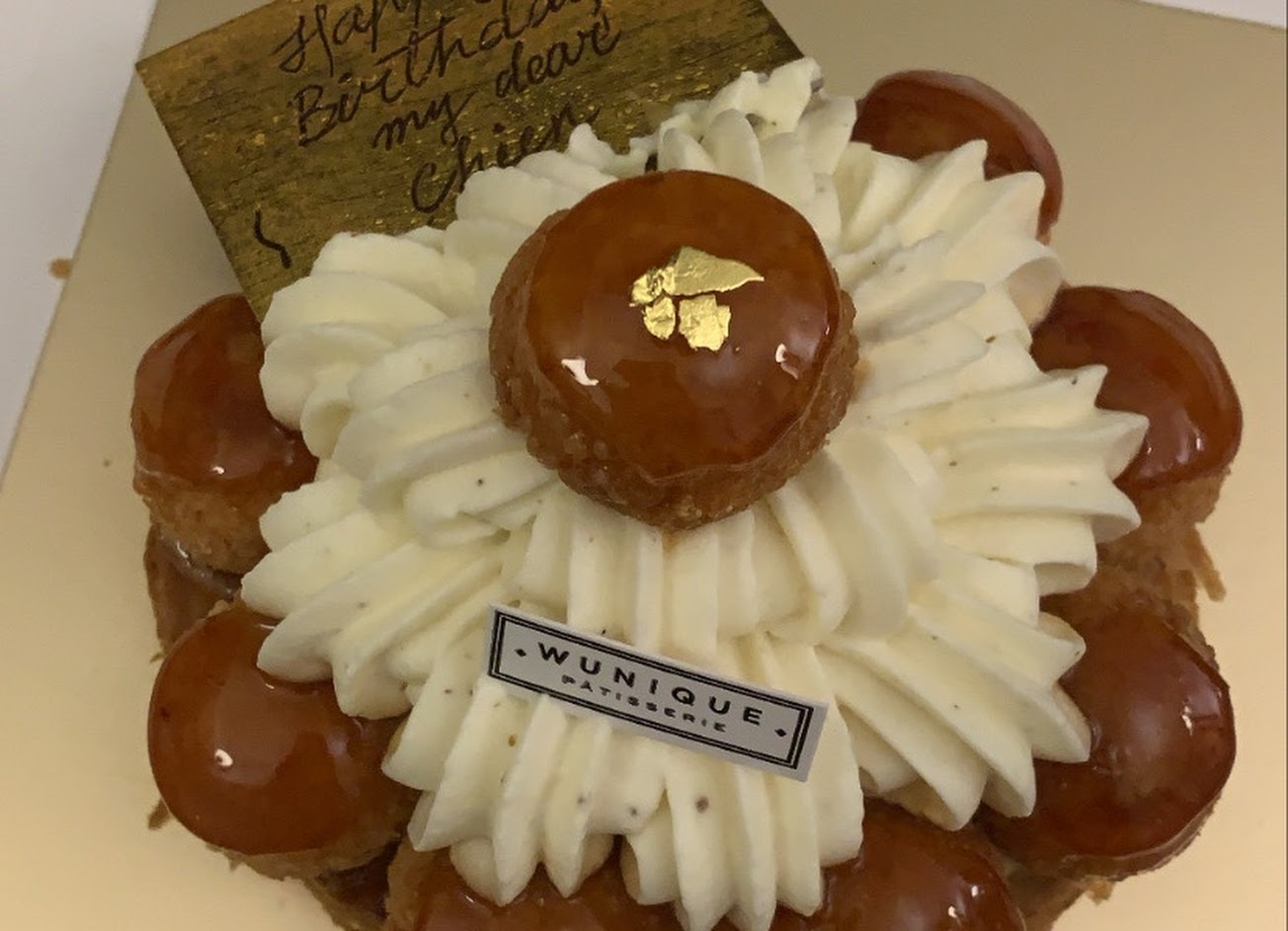10吋的J 很好吃!泡芙外層的焦糖脆脆的?? 奶油很綿密、很香 下層的千層非常好吃 整體很有層次! 還有灑了一點金箔 以後還會再買?