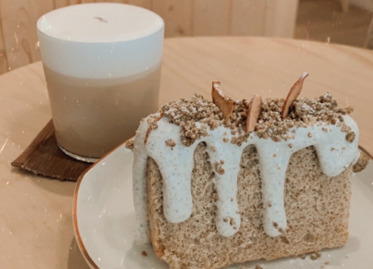 這款茶口味的蛋糕應該是最驚艷我們的,柔軟的鐵觀音戚風的茶香超級濃郁,完美呈現鐵觀音的微苦和獨特香氣,再配上有著茶葉末的鮮奶油還有甜甜的鐵觀音酥粒,如果不是吃不下了應該還可以再點一個。
