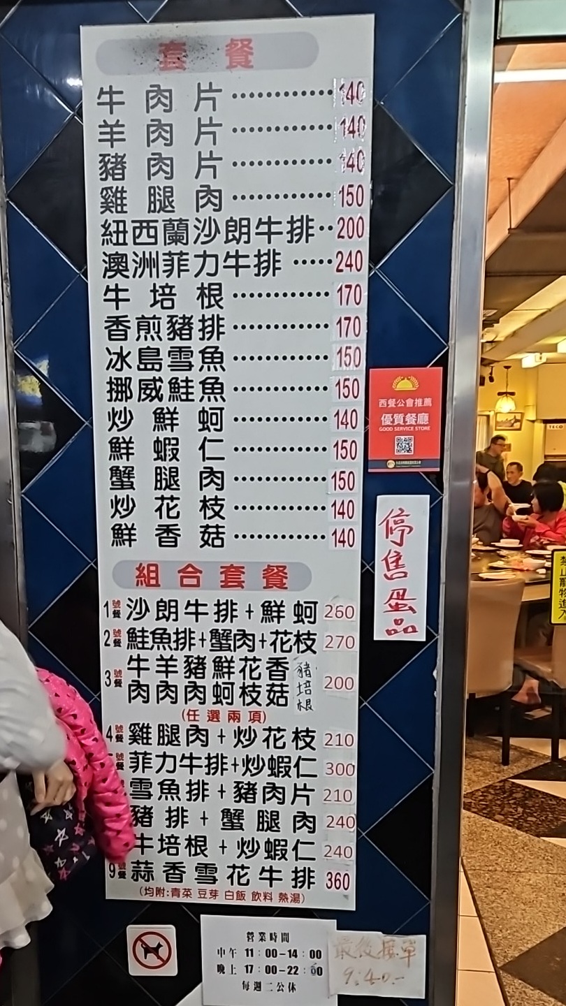 晚餐時間,從象山運動下山,在信義路六段附近看到這家鐵板燒生意很好,大約6點到的,客滿狀態,在櫥窗外看了一下菜單,女店員很有禮貌的出來接待,立馬決定吃這家,入內馬上一股傳統牛排館的香氣撲鼻而來,果然沒選錯,稍微等五分鐘就上桌了,