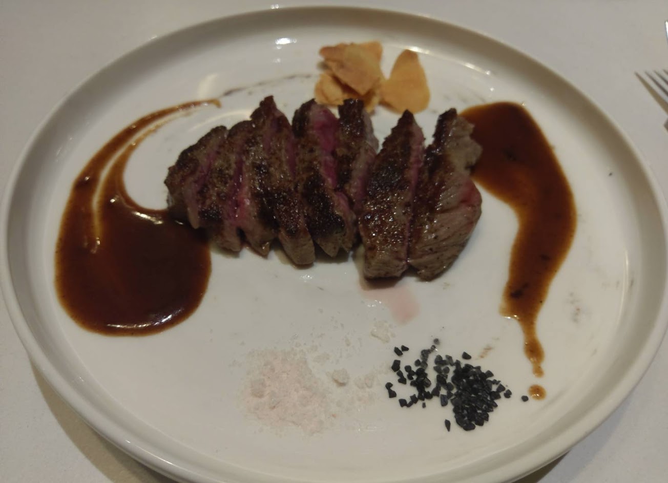擺盤和食材很不錯,考量雙人套餐無法自行選擇餐點,兩人各自點了套餐+2000元主餐換選和牛,鵝肝很大塊,喜歡吃鵝肝的人應該會很爽,雖搭配了蘋果和洛神醬解膩,吃到和牛時,我個人還是覺得有點負擔、有點膩。老饕牛排很棒,個人覺得口感超越和牛。
