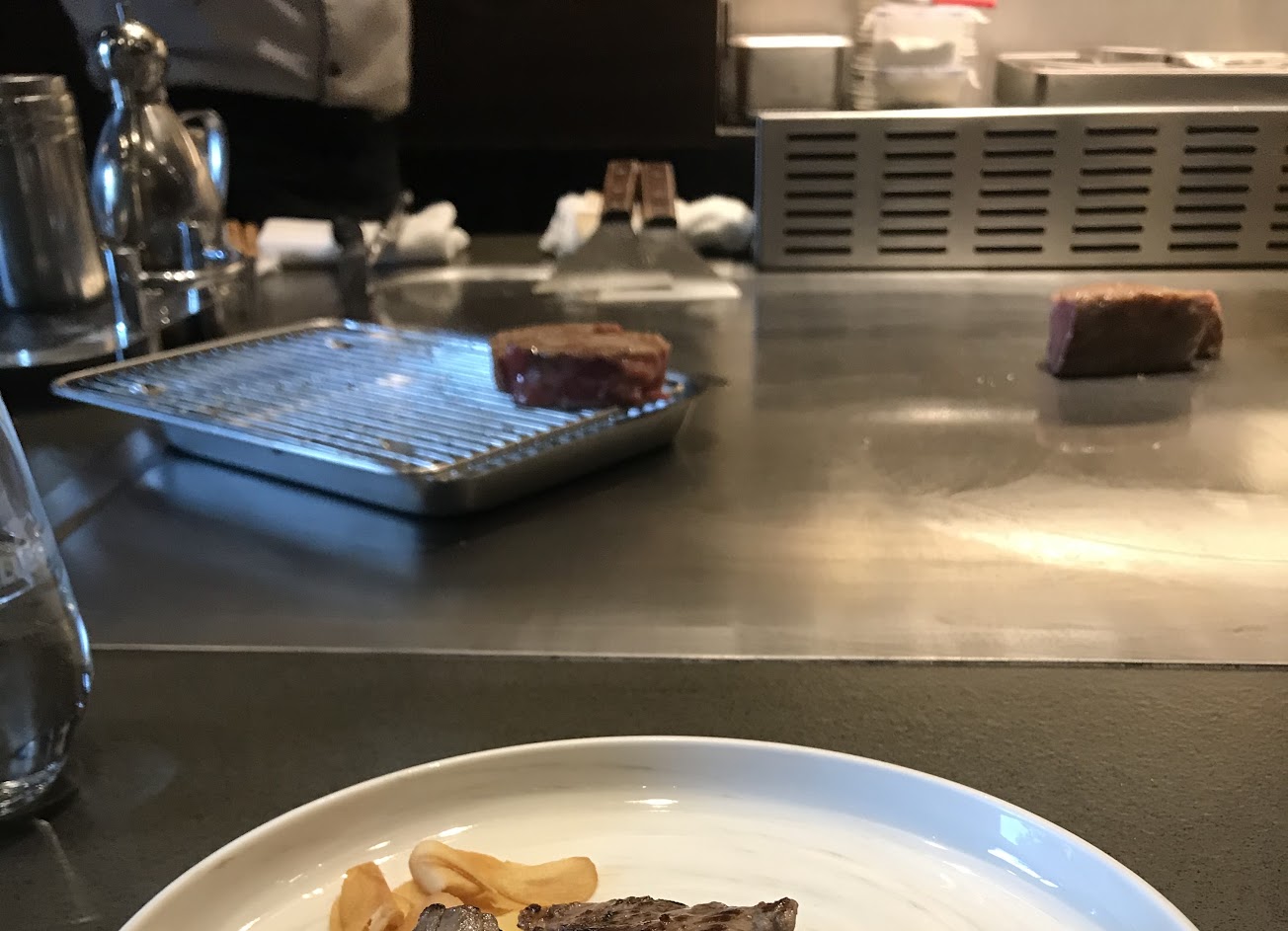 餐點不行: 不知道是不是人手不足,感覺每道菜都等很久,然後在我們前面料理的主廚常常一次準備很多人的份量,但我覺得準備順序有問題,例如: 1. 餐點主體都很早就先放到盤子,才開始慢慢擺盤,但也沒有先暫放在鐵板其他溫度沒那麼高的地方保溫,例如蝦子好了,我就親眼看著主廚把蝦子放到盤子裡等了老久(應該有5分鐘以上),但這期間才慢悠悠的處理黃瓜片跟櫛瓜的擺盤..蝦子就是要趁熱吃才好吃阿,更何況這家是「頂級鐵板燒」,鐵板燒的重點之一就是至少要熱吧? 雖然我點的不是蝦子,但我光是在那邊看就覺得焦急,蝦子都冷啦!!! 而且這個是可以避免的失誤,主因是主廚把瓜片跟櫛瓜片全部疊在一起,沒先分開,導致一開始硬硬的煮熟之後,很軟,很難分開,就看他在那邊耗了半天(也覺得還好沒加價點龍蝦,因為後面看到龍蝦也是類似情況,先放肉,再為了殼顏色好看,還特別加熱,再放殼,最後放湯跟分子料理式的泡泡….這樣龍蝦肉冷掉會先有點硬,再加湯,如果是熱湯,那就會過熟,變很老,最後是分子泡泡的味道,感覺會蓋掉龍蝦本來的新鮮口感,完全浪費新鮮的龍蝦)。然後我點的鮑魚也是,每次主廚都野心很大,處理很多份,但是動作很慢,冷氣又強,餐點根本冷得很快,看得心很累,覺得暴殄天物。其他還有太多,都是類似的,主要就是擺盤熱度還有鮮度的拿捏吧。 2.鱈魚也是(一樣我沒點,但是看了處理方式也是搖頭的),先煎好,然後丟到一盆醬汁裡面,這樣感覺煎魚的酥脆表面就會吃不到,而且放很久,感覺魚很冷。 3.還有看到主廚用手抓鹽,或是裝炒飯的時候,把大拇哥伸進碗裡,這樣放進去的炒飯都會沾到一點大拇哥,覺得觀感不佳。 4.還有,雖然前面提到,主廚花很多時間在擺盤,但老實說,擺盤技術真的有待加強,我親眼看到擠那個醬,就是很多圓點(有大有小的那種)的那種,它每盤都長得很不一樣,那個間距明顯就是大歪,感覺有點恩…. 5.擺盤的醬都感覺是為擺盤而擺盤,配餐感覺很不搭。 6.鴨肝大大大大大大大失敗,煎太久,覺得有點失望。 7.主菜完全不行(沙朗跟伊比例豬)