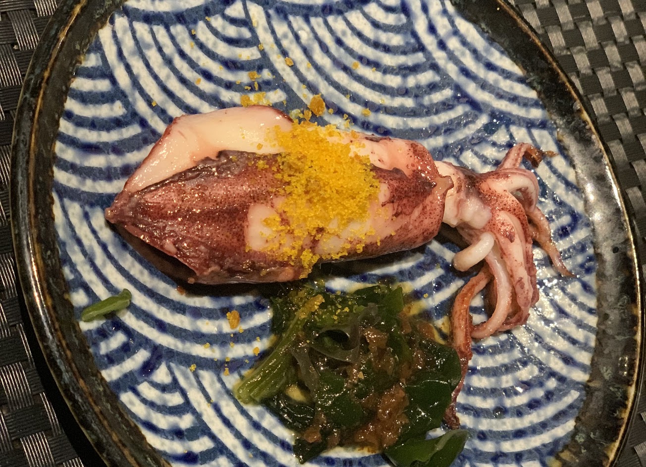 小卷鮮甜,搭配柚子紫蘇醬,再灑上烏魚子粉,超對味。