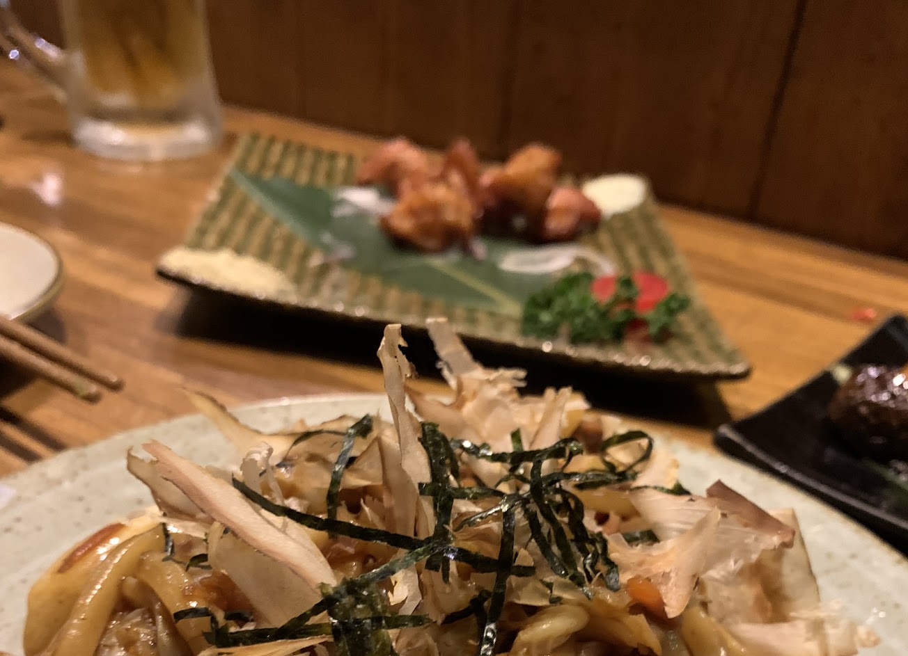 吃了 明太子玉子燒 明太子山藥 可麗餅 厲害的西京燒魚 蛤蜊牛肉麵 炸牡蠣 剝皮辣椒雞翅 烤玉米筍 梅子酒 柚子酒 梅子啤酒