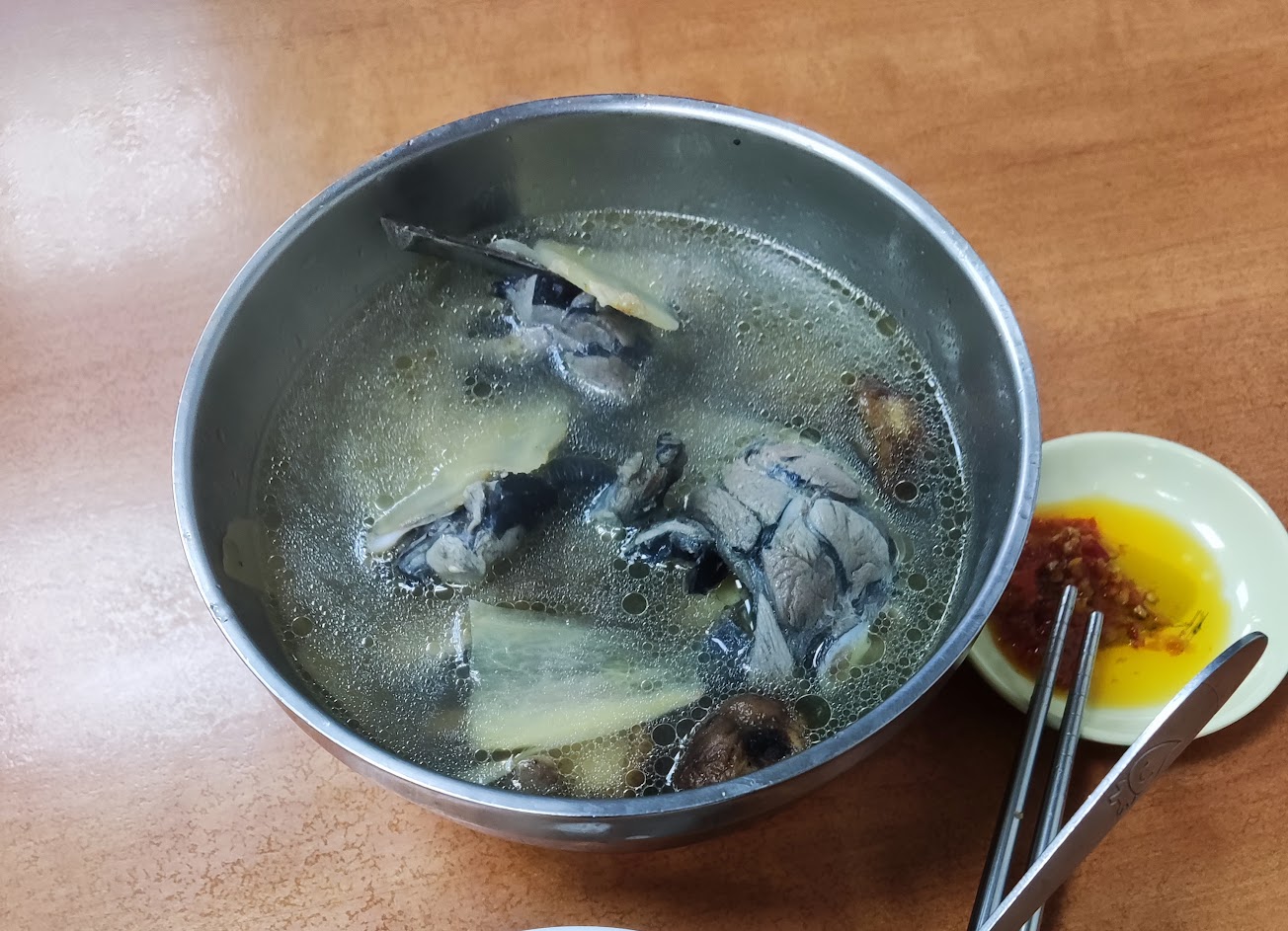 點了四物+雞肉和乾麻油麵線,四物就是沒有多調味的枯燥四物味,雞肉柴,麵線很濕,麻油味蠻淡,朋友點香菇雞湯裡的香菇微小乾扁,整體價位偏高