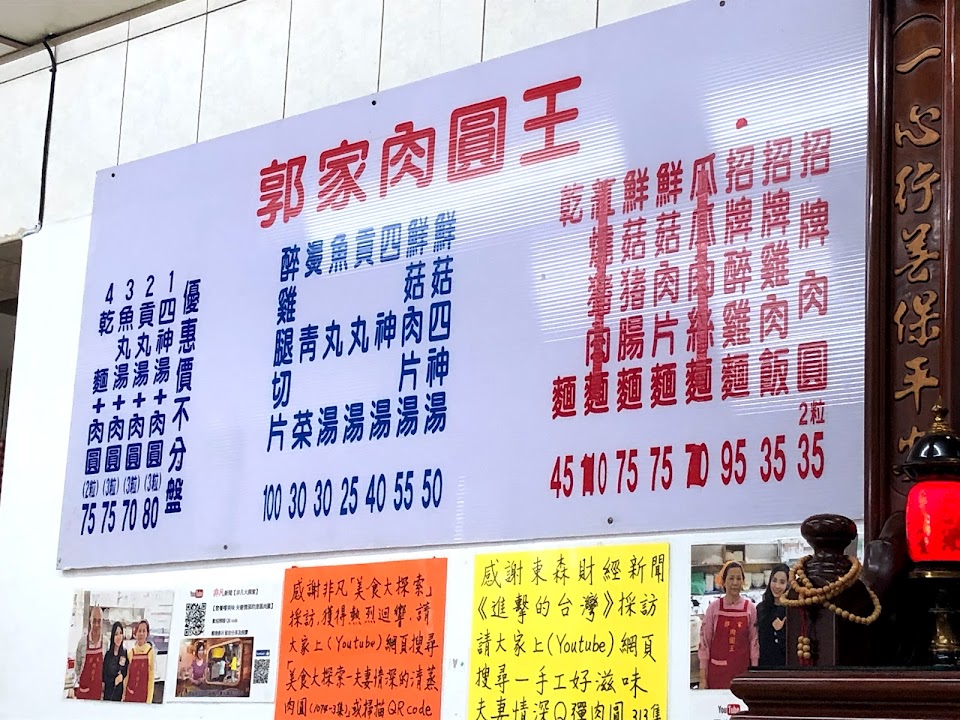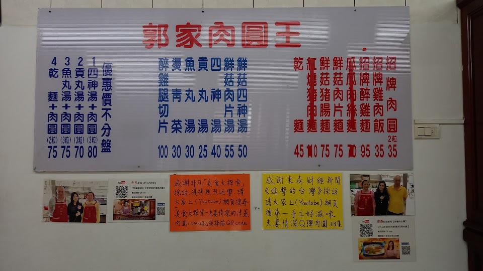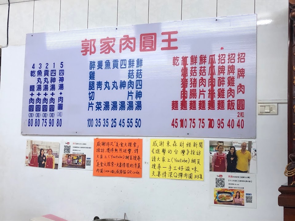 郭家肉圓是我朋友不經意介紹給我的,當我有一次談起台北都沒有好吃的蒸肉圓時,一位住在松山的朋友說他有一間從小到大的第一名肉圓,這跟我聽到復興南路sogo 對面彰化肉圓(炸肉圓)一樣興奮,其實在我之前吃過了很多蒸肉圓,但是就是沒有這一家味道這麼好吃,肉圓皮的Q度 很夠,雖是蒸肉圓,但是仍舊吃的到QQ的皮,加上醬料後,我確認這就是台北排名前幾名的肉圓。至少是松山第一名。郭家一家三口一起經營都被媒體爭相報導,牆面上到處除了菜單到處都是恩案的夫妻版面,除了蒸肉圓,四神湯,乾麵, 從1號餐到5號餐 我覺得都是很超值的選擇! 最雞肉推切片、鮮菇肉片湯加一碗乾麵也是很好的選擇。大推喔!!