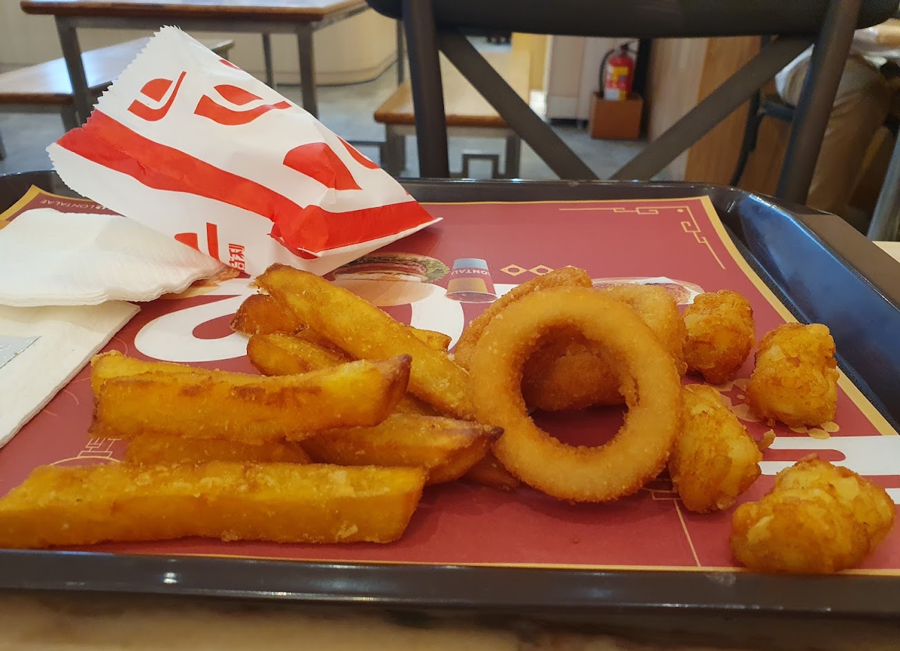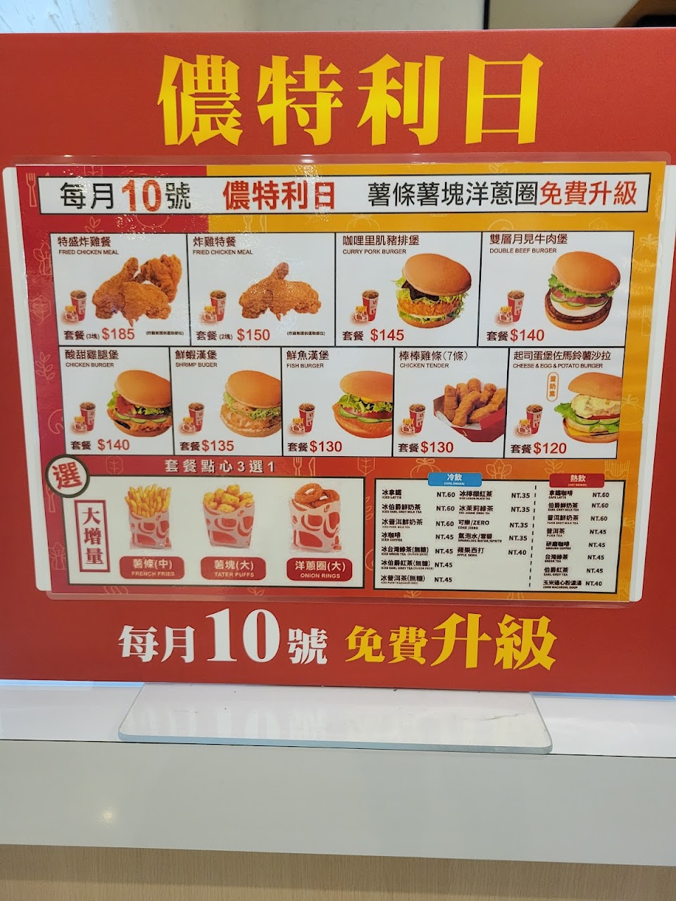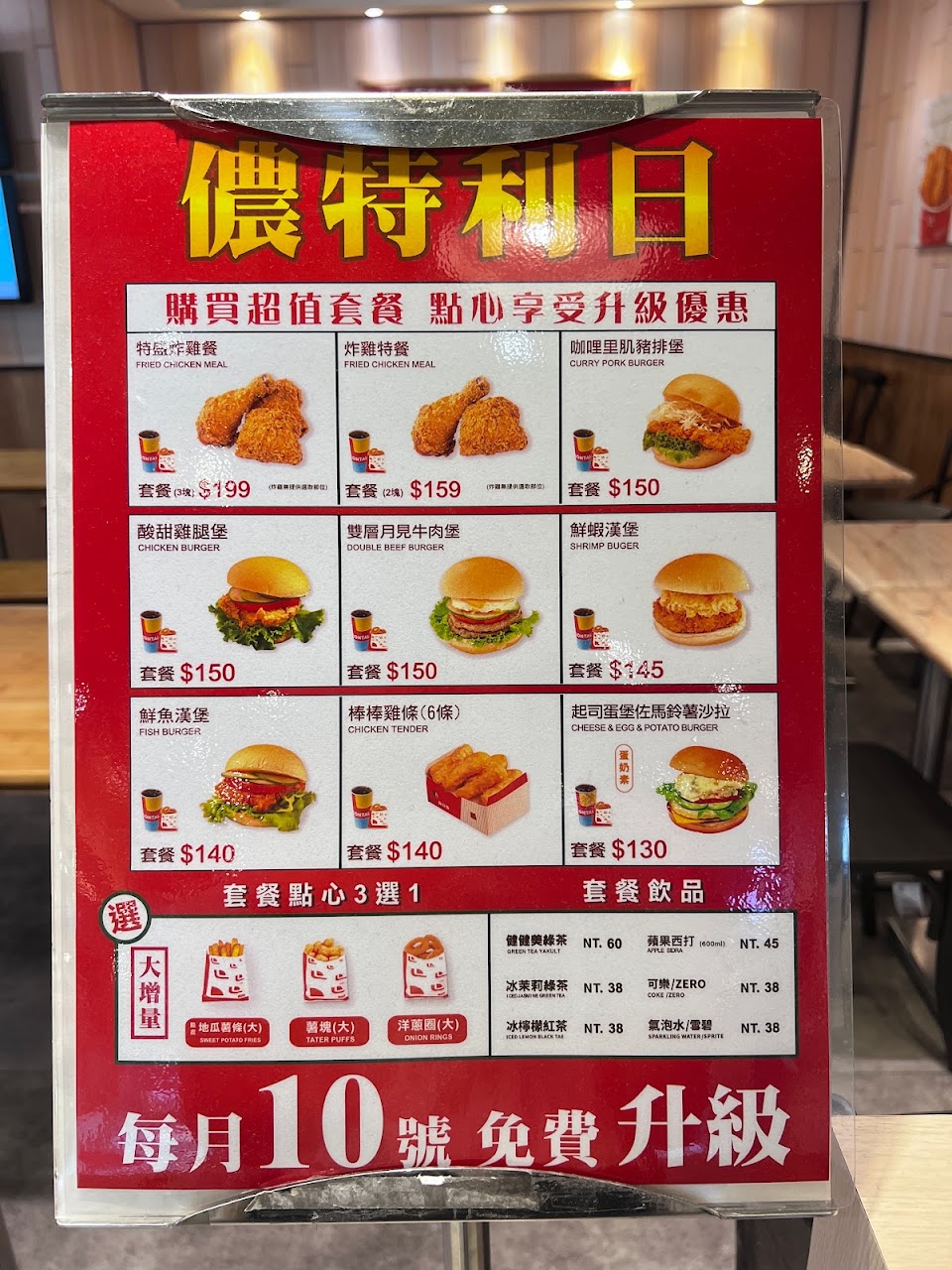 主餐餐點選擇種類只有四樣,三種漢堡+雞塊。副餐只有薯條和地瓜薯條可選擇。座位區看起來很大,因為區分上沒有很好,所以感覺以有雜亂感。想喝無糖飲料,店員推薦紅茶,是一分糖所以喝起來不甜。地瓜薯條吃起來有點乾,鮮蝦堡還可以,麵包比預期的好吃很多。