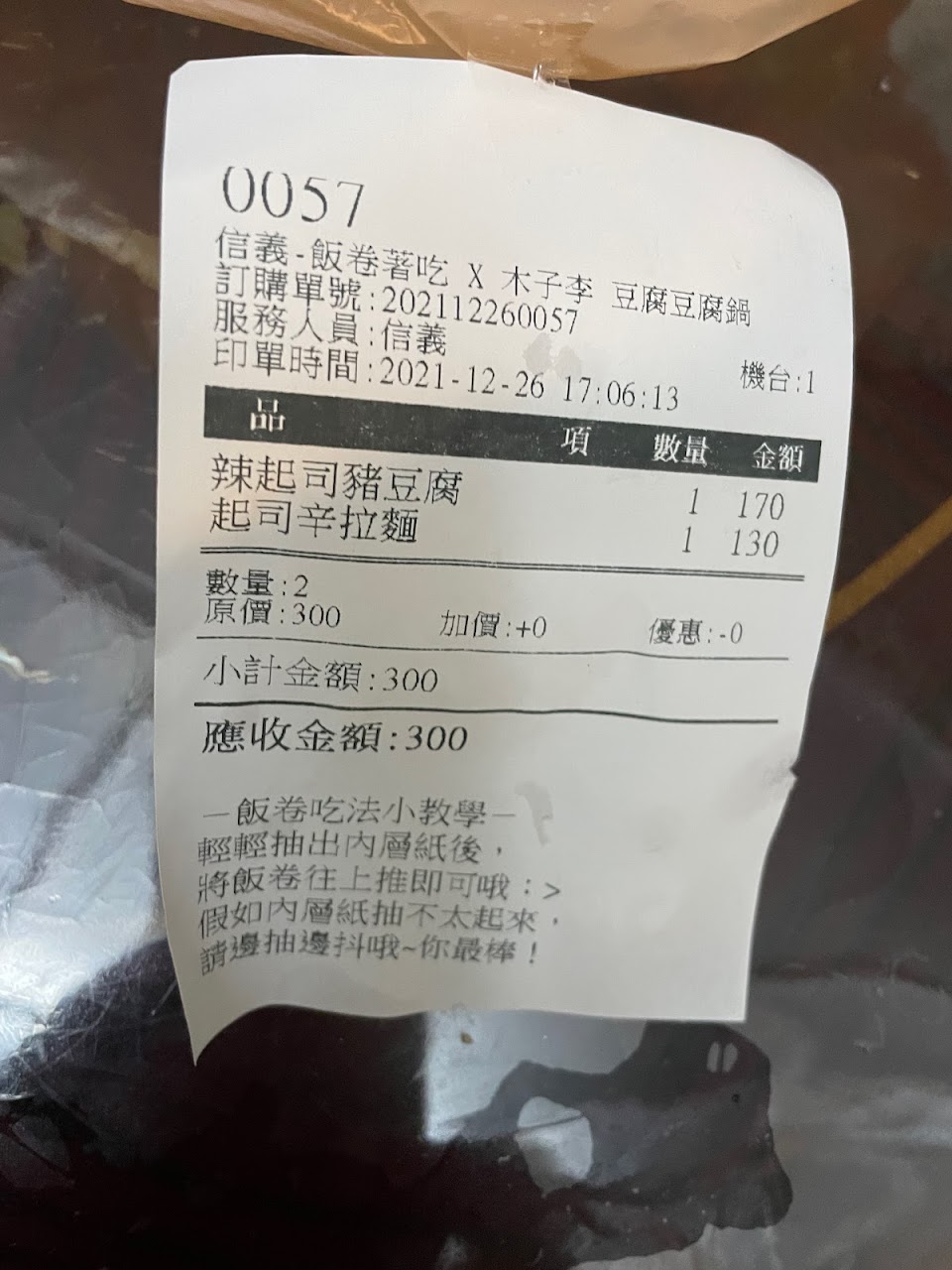 透過外送平台訂購「卡拉雞腿飯卷」 因家人不吃豬肉 飯卷來了!