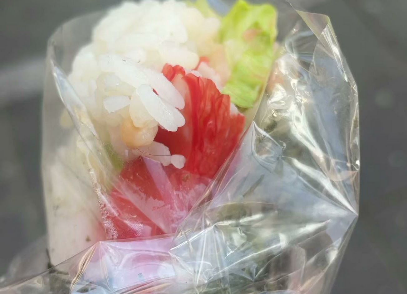 飯卷組合方式,要把飯的那個袋子拉起來再抖,不然直接拉袋子抖是很難的。