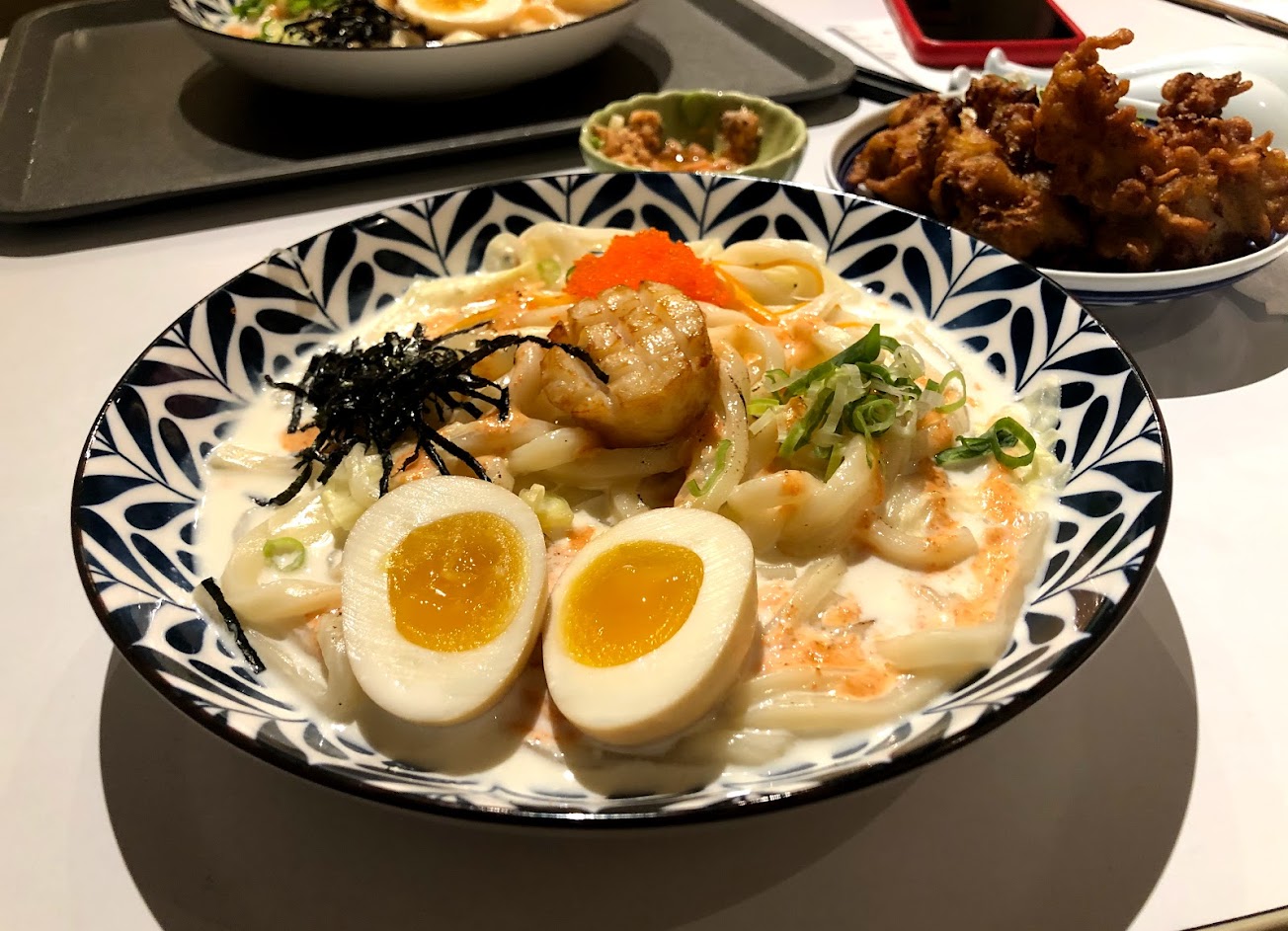 明太子奶油干貝烏龍麵才$99 cp值超高! 而且也非常好吃 醬恰到好處 麵的口感很棒 加套餐才多一點錢就能吃到炸雞、小菜、溏心蛋 真的很划算~~ 如果開在我家附近我一定吃爆! – 唯一雷的是小菜清酒鮭魚 有一種無法描述的怪味 不好吃!絕對不要點! – 那天快吃完時眼睛突然超痛 轉頭一看原來是店員在店裡切洋蔥 那種刺辣感一直到走到捷運站才消退⋯ 可能需要注意一下 不要在離客人太近的地方切洋蔥?