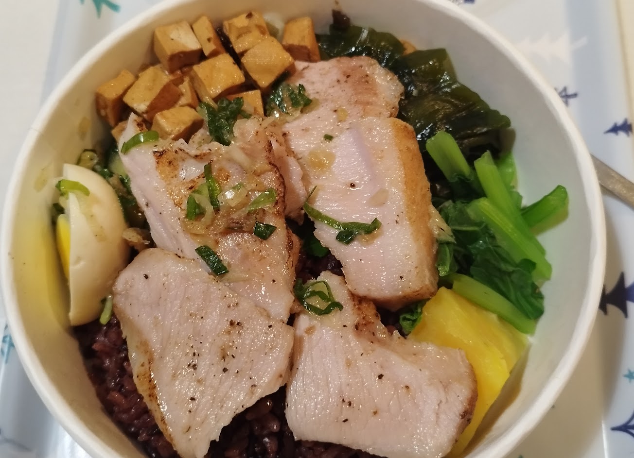 配菜為紫米、一點高麗菜、一點小白菜、半顆蛋、三色豆⋯