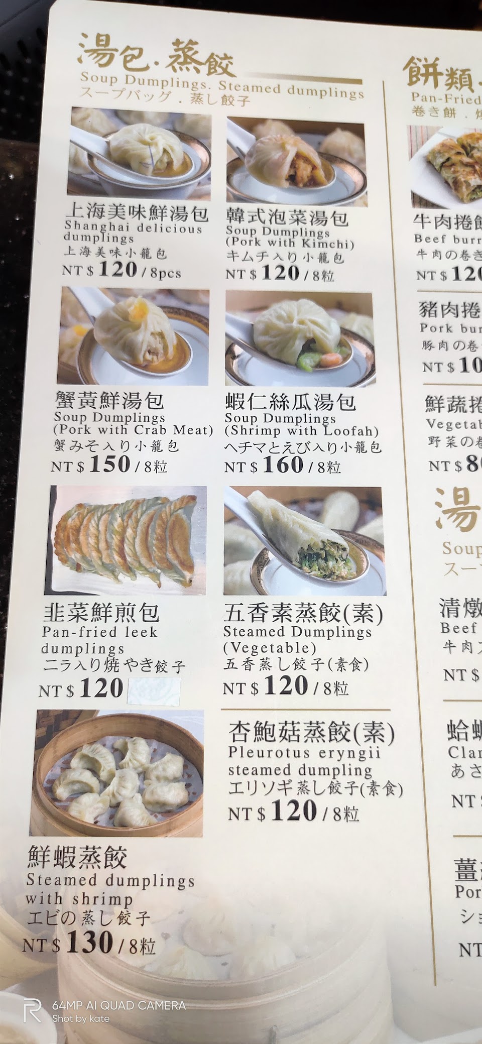 價格:鮮肉湯包 130, 絲瓜蝦仁湯包 170, 豬肉捲餅 110, 肉片湯 60