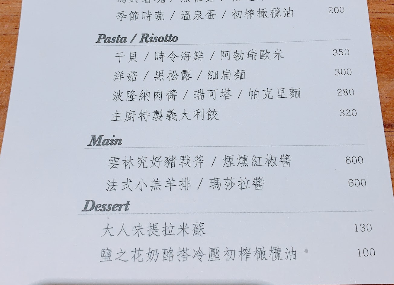 雖然候位時間有一點長,但是好的東西值得等待,預約候位後可以在附近逛逛、吃個甜點,很可惜大菜沒供應,但是主食很完美,完全可以補足,主食麵類的是有嚼勁的,也不會有很重的麵粉味,醬料很香而且不會過鹹,吃到後面也不會讓人覺得油膩,可以把餐盤裡的醬都吃光的那種,雞肉軟嫩,搭配醬料黑暗咀嚼出來的雞汁做了一個很好的搭配,價格合理如果有餘力,很推薦他們鹽之花的奶酪,是一個完全不同的味覺享受
