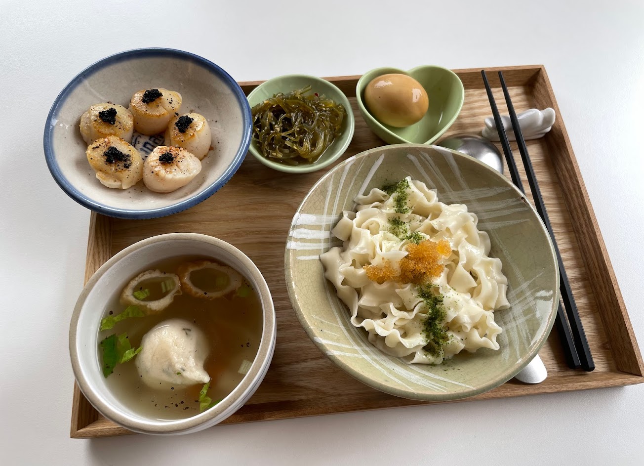 雖然一開始看價格會想說好像有點貴,但吃完一整個套餐就覺得非常值得,飛魚卵拌麵不是只有上面一點點,往下拌還有調味的醬,讓每一口都有魚卵的口感。而配餐調味上也都很用心、沒想到一整份吃下來真的很滿足。後來男友還加點了干貝❤️很好吃! 謝謝主廚以及服務的每個人的用心