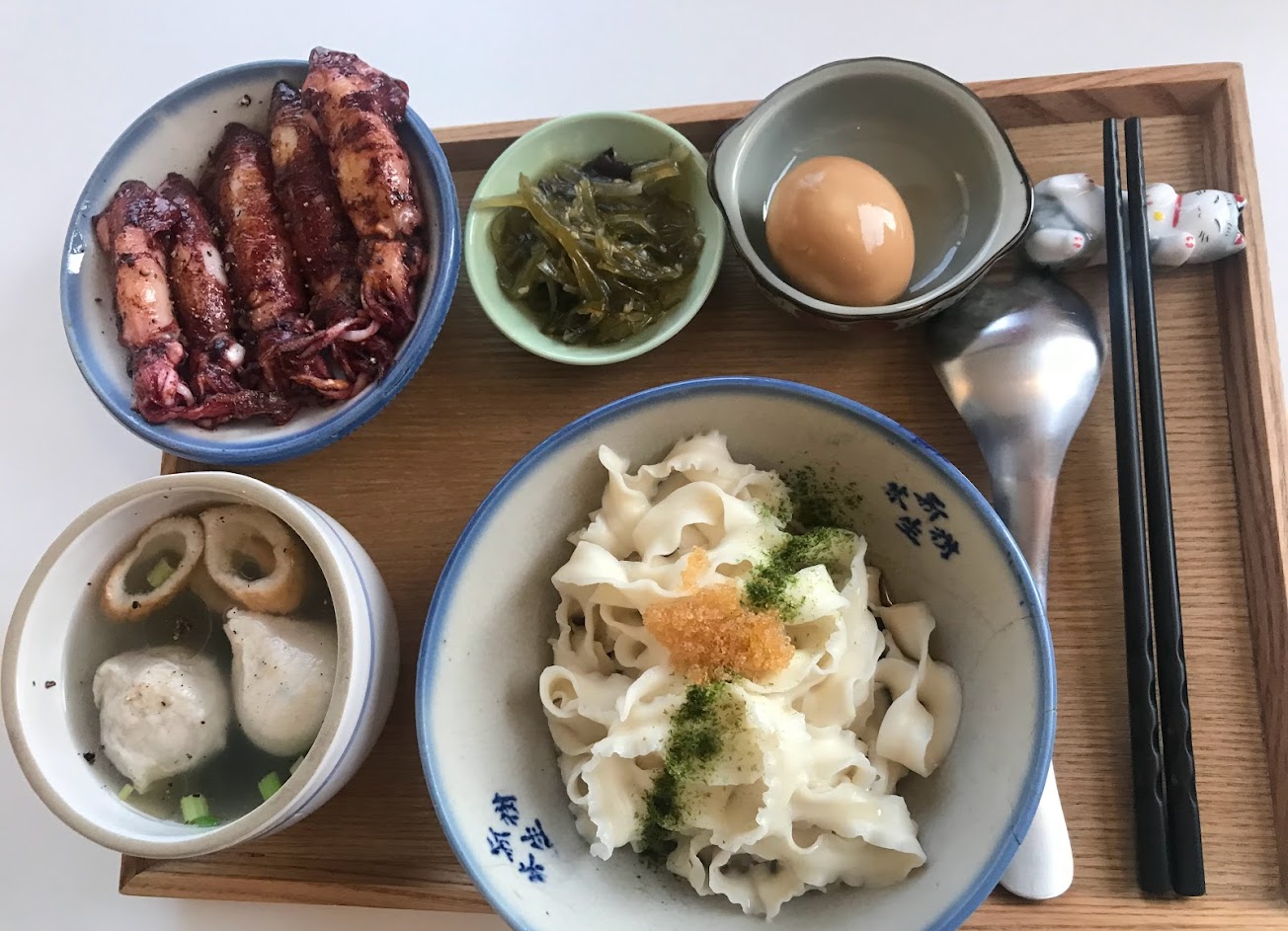 魚卵拌麵不錯,吃到最後覺得很鹹,配清爽魚丸湯,有平衡口感。小卷新鮮,原以為吃不飽,結果吃太撐?
