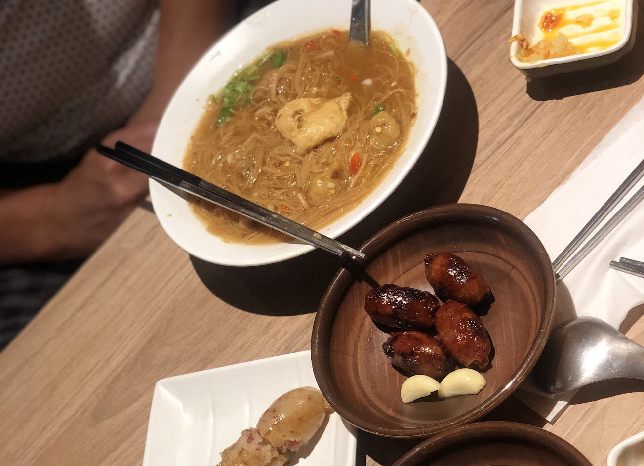 主餐食為創意麵線,之所以這麼介紹全憑大腸羹這項配料,再搭配上魚酥的酥香口感,這組合讓每一口麵線的咀嚼更有層次與念想了!