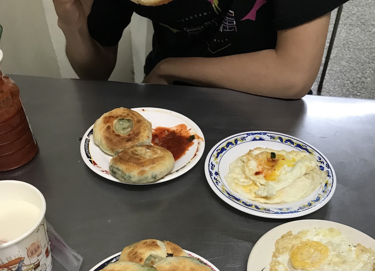 蔥油餅口味不會很重,煎過再烤比較不油膩,吃起來清爽有層次。 蛋餅是煎過的蔥油餅,很油,滿滿的熱量,可是很好吃。豆漿好喝,陪油煎的蛋餅剛好。