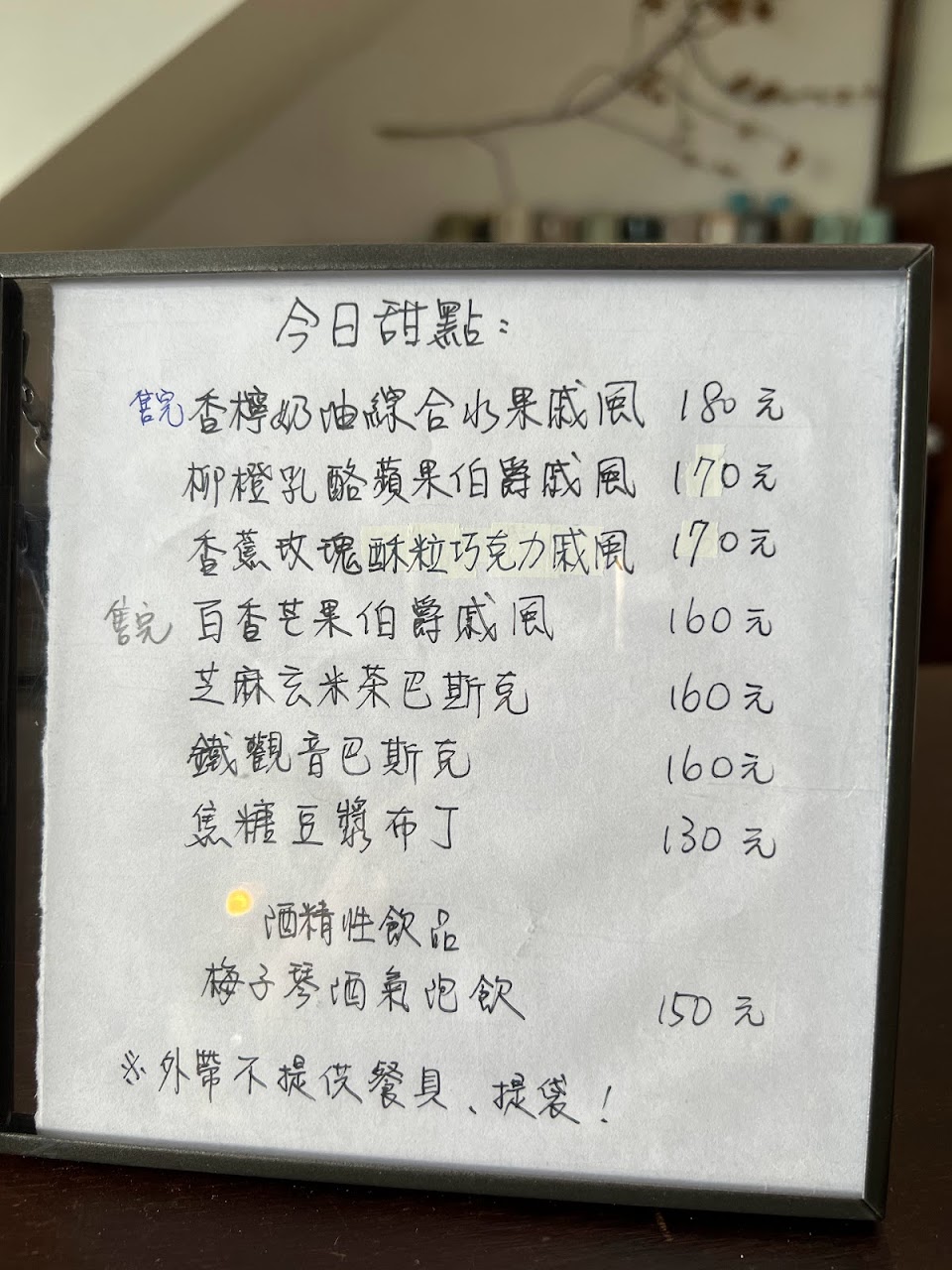 飲品選擇不多,大多都是茶類,咖啡只有手沖咖啡一種。甜點每天提供的都不一樣,想知道有什麼口味可以先看粉專,太晚去可能也會售完。