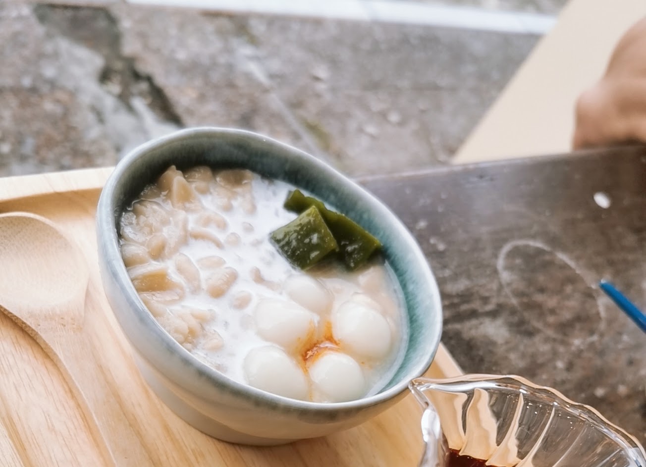 蘑菇湯感覺有認真做,好像不是一般用粉泡的,配烤得酥酥的可頌非常美味。 很可惜吃了一大半發現湯裡有頭髮,店家雖然馬上補來一碗新的,不過應該都是同一鍋吧? 我們選的兩種湯飯都很好吃,小菜也有用心做,只是我的飯裡面有一坨一坨的結塊(圖三)…抹茶冰個人不愛但同行親友都說好吃,我比較愛芋頭花生這碗,好大一球,圓圓的拍照也好可愛。我們沒看到要等待安排入座的告示,因為太早到餐廳還沒開、長輩也腳痠了,就先在門口的座位坐下來,還好店家也很親切客氣沒有要我們起來。坐著聊天吃吃喝喝很輕鬆。旁邊船隻發動時會有一點味道和噪音就是了。