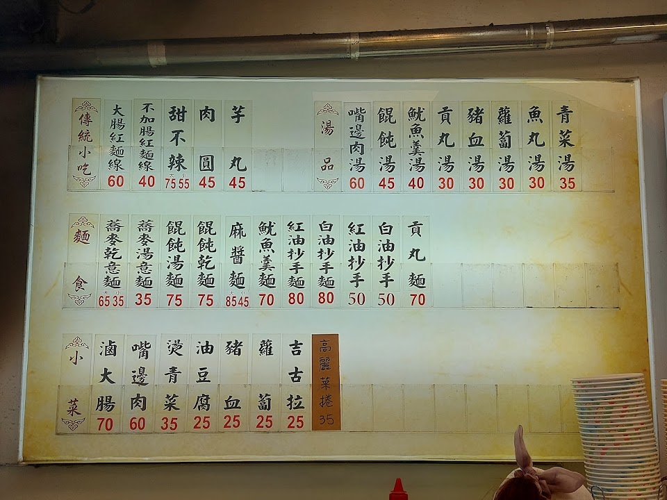 紅麵線:某尬乙,太過湯湯水水,羹和水沒有融合均勻,很像是羹煮完後再加水讓量看起來變多。湯頭基本上都是麵線的生味,「紅麵線」這名字取得恰到好處,主角完全是麵線,料和湯頭都被忽略了….料的部分,大腸看起來很新,不夠軟爛,吃起來有股怪異腥味;加了一顆魚丸,不是很搭。