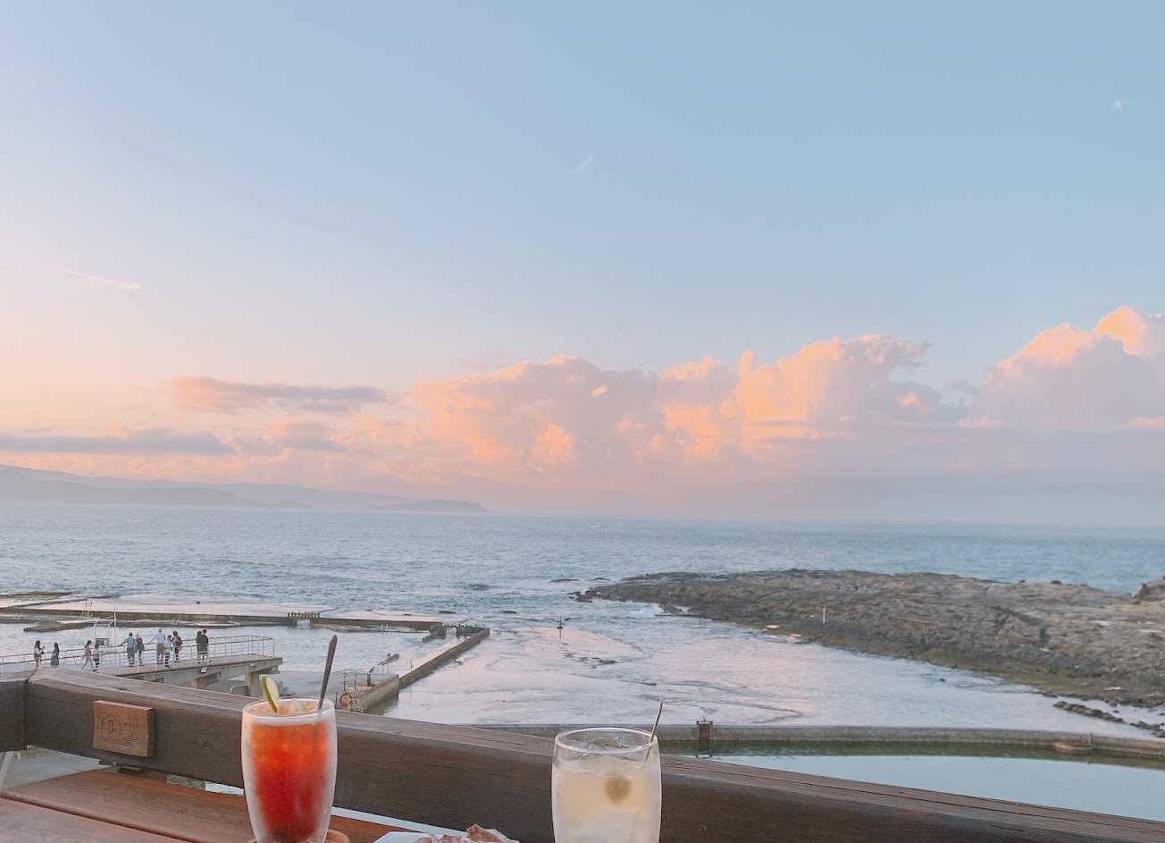 點了兩個沖繩共島季限定的飲料:懷珠石花嶼和惜別的海岸,還有飛魚卵吐司~~海景跟食物都不錯(但風略大,冬天應該冷爆)