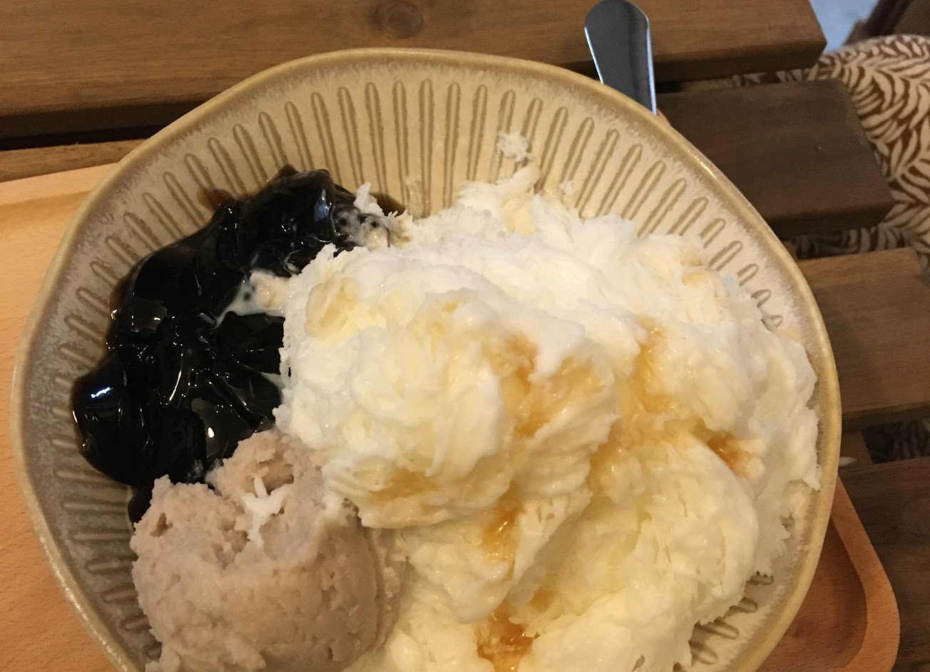 刨冰非常好吃,冰上有奶茶的香味,非常好。刨冰上面有珍珠和果凍,非常好吃,而且價格也合適。