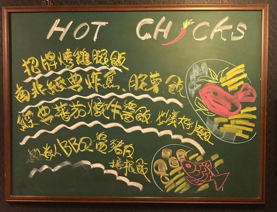 一開門迎來的是熱情的老闆娘 黑板上寫著店內的招牌菜:「招牌辣烤雞腿飯」、「經典番茄燉牛醬麵」、「BBQ醬嫩煎牛肉培根飯」