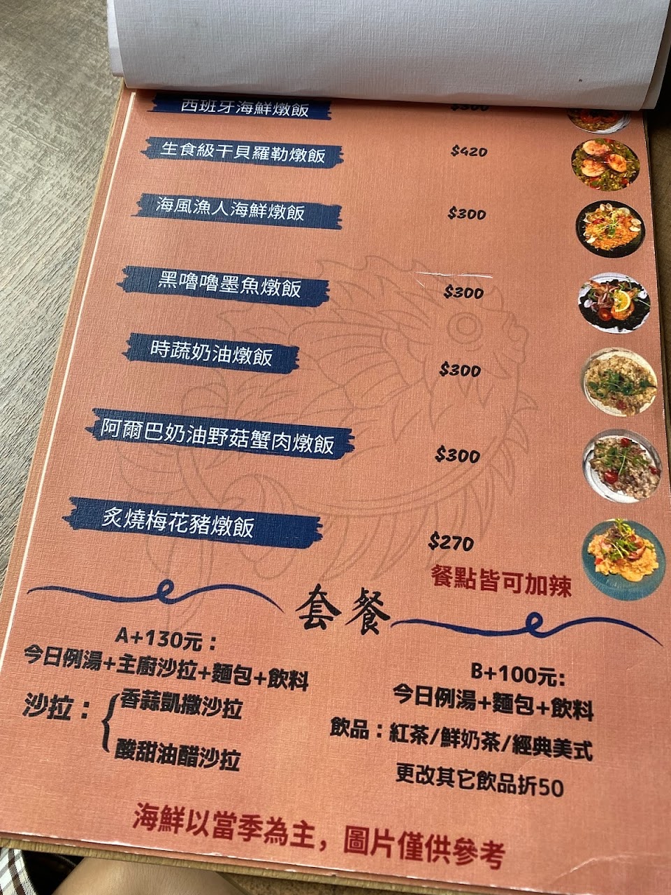 餐點與照片上差異很大、海鮮減半、內容物也不同,詢問店員每個人答案都不一樣!如有漁獲不足,建議不要提供該餐點,內容物如調整也應該在點單時就清楚告知!不老實的店家、很不OK!