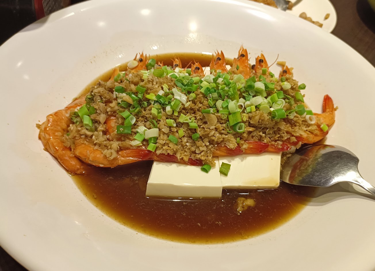 我們點了銀絲卷、皮蛋鹹蛋地瓜葉、雞肉(小份)、無錫排骨、蒜蓉蝦、黃金炒飯,店家招待香菇形狀的芝麻包,銀絲卷大概是8份,油濿得夠乾,熱熱的外酥內軟,和無錫排骨濃郁黏稠的肉汁搭配很適合,排骨肉和筋膜軟嫩,火候掌握的很好,口味偏重,皮蛋鹹蛋地瓜葉的湯頭差了一點點的鮮味,口味清淡,雞肉軟嫩搭配蒜蓉醋鹹醬以及小黃瓜,吃起來相當清爽健康,蒜蓉蝦的個頭和新鮮度都很到位,搭配下頭的豆腐算是中規中矩的好菜,黃金炒飯鍋氣還可以,但調味偏淡。整體用餐體驗很好,老闆和服務的阿姨都算親切,另外不收開瓶費並提供杯子和冰塊,整體給予五顆星評價。