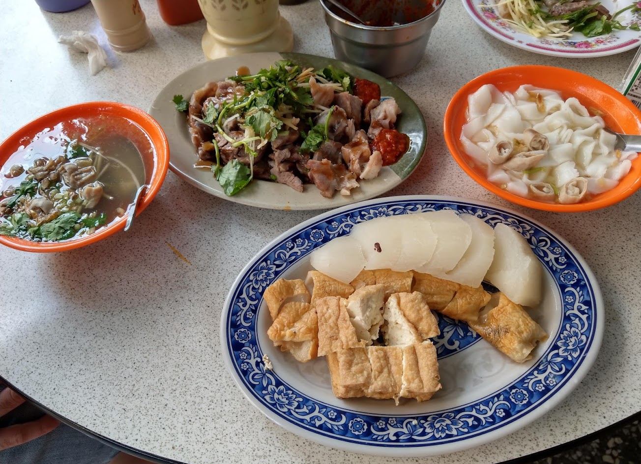 店外真的有一股滿”特殊”的味道,可是粿仔湯本身倒是不會太臭,湯本身滿清甜,粿條Q彈有嚼勁,另外不論湯的還是乾的都有加些切成小截的腸子當作配料,推薦搭配店內自製的辣椒醬食用,非常好吃,很香又不會死鹹死辣的辣醬整個大加分,小菜推薦高麗菜捲和吉古拉,吉古拉其實像是較薄的空心黑輪,有嚼勁之外也有魚的甜味。