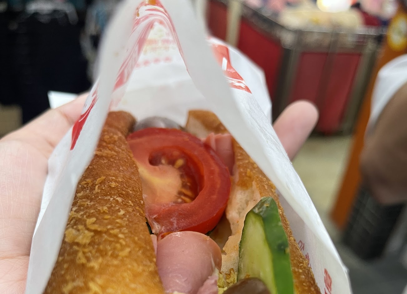 排隊人潮多,但準備迅速很快就可以買到,麵包Q軟偏甜,內餡豐富有滷蛋、切片火腿、小黃瓜、蕃茄,3個只有100元便宜又好吃