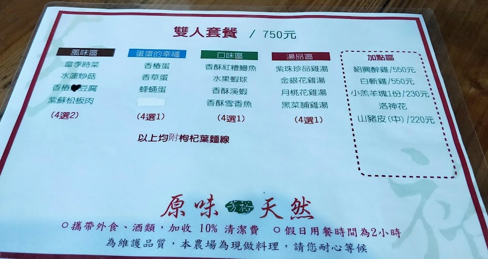 這裡沒有單點的菜單喔!是以套餐模式供餐,我們 2 個人,小姐拿了一張 “ 2 人套餐和 3 人套餐” 的菜單給我,兩人套餐是 790 元, 3 人套餐是 1,180 元,我問小姐差別在哪? 她說只是份量多寡而已,原來套餐模式就是在菜單上的選項中各選一種( 其中蔬菜類是 4 選 2), 總共是 4 菜一湯,還有提供枸杞葉麵線